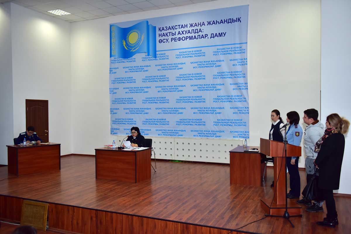 31 марта 2016 года в Конференц-зале Евразийского гуманитарного института прошел выездной показательный суд с участием судьи специализированного административного суда Аркабаевой К.Ж., представителя прокуратуры Алматинского района г.Астаны Мустафина К., заместителя начальника местной полицейской службы УВД района «Алматы», подполковника полиции Айшыбеков А.А., представителей СМИ, а также преподавателей и студентов института. Предметом судебного разбирательства явились мелкие хулиганства, квалифицируемые как административные правонарушения, предусмотренные Кодексом об административных правонарушениях Республики Казахстан. Показательные судебные процессы уже стали традиционными профилактическими мероприятиями в нашем городе, направленными на правовое просвещение молодёжи. Самая главная цель показательного процесса – это продемонстрировать студентам работу принципа о неотвратимости наказания.