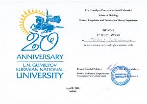 Congratulations to Dashkevich Oksana for taking the 2nd place (the student of group ПДС-14-01), Tuleutay Askar for taking the 2nd place (the student of group ПДС-14-01), Suleymenov Olzhas for taking the 3rd place (the student of group ПД-3-18) in the Inter-university Student Olympiad on the specialty “Translation Major”, held on the basis of the L.N. Gumilyov Eurasian National University.