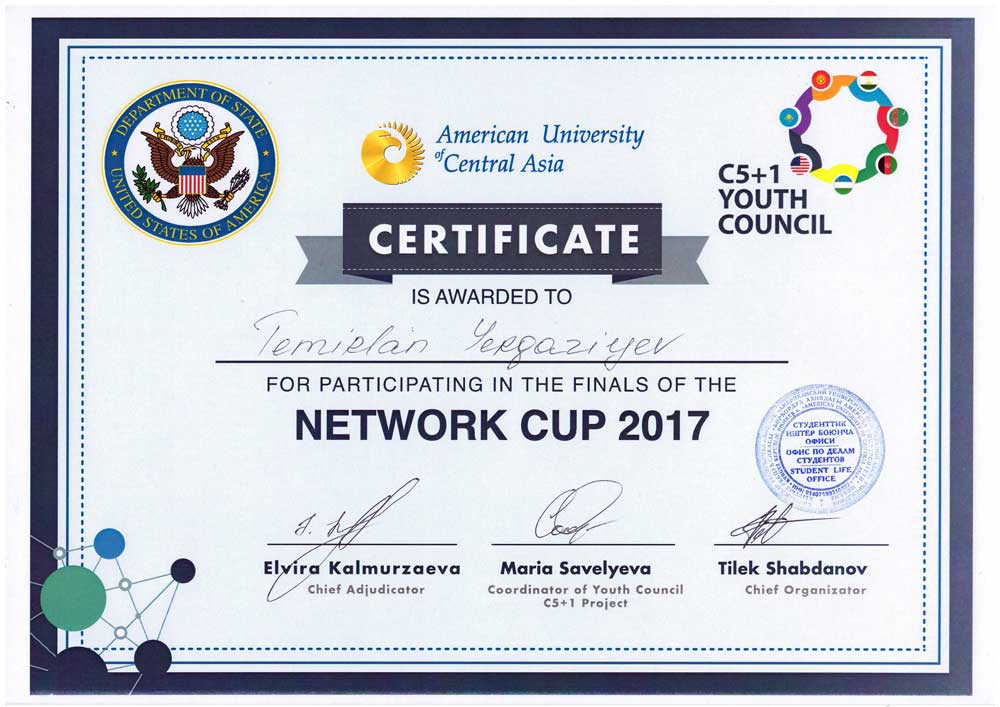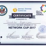 The American University in Central Asia under the support of the USA Embassy in the Kyrghiz Republic within the project: Youth Council C5+1 conducted the international tournament on the debates:”Network Cup 2017″. The debate tournament took place on 27-29 January. Two language leagues took part in it: Russian and English. The student of the Department of Foreign Languages of group: ПД 14-01 Yergaziyev Temirlan took part in the English league in which 24b teams took part. The team of Temirlan became the most effective team on the results of selective rounds. In the individual competition our student became the best speaker. This event was organized to unite the progressive youth of Central Asia for discussing urgent problems of the regional and international level. The tournament was aimed at consolidating and creating effective communicative sites for future leaders.