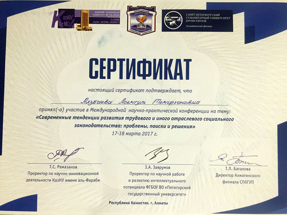 Master of social science, the senior teacher of the Department of Pedagogy Ayazbayeva Assemgul Temirhanovna made a report on the theme: «Қазақстандағы мүмкіндігі шектеулі адамдардың еңбекпен қамтылу мәселесін әлеуметтік зерттеу» at the International scientific-practical conference “Contemporary tendencies of developing the labor and other branch legislation: problems, searches and solutions” which took place on 17-18 March 2017 in Almaty – city at the Kazakh National University named after Al-Faraby.