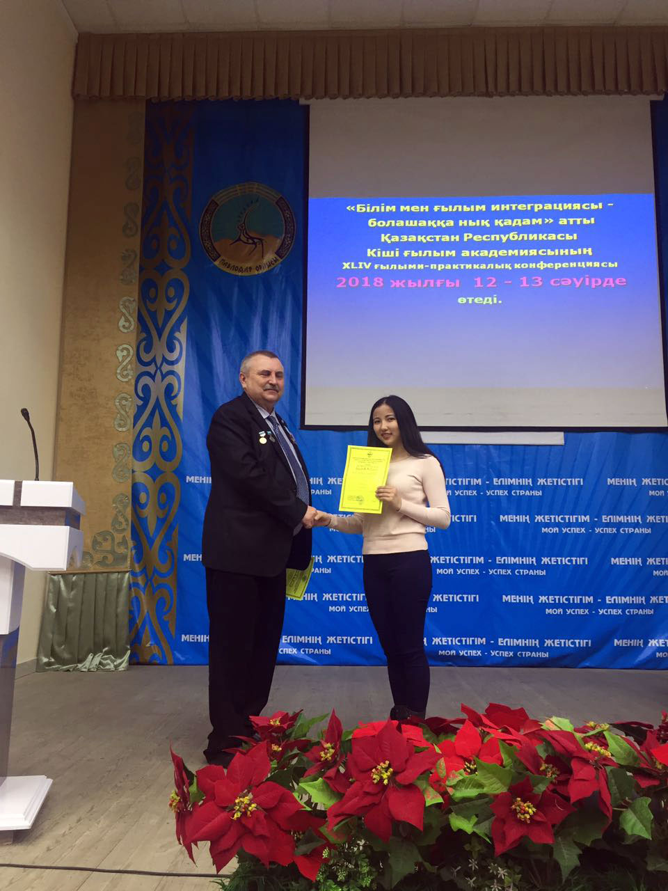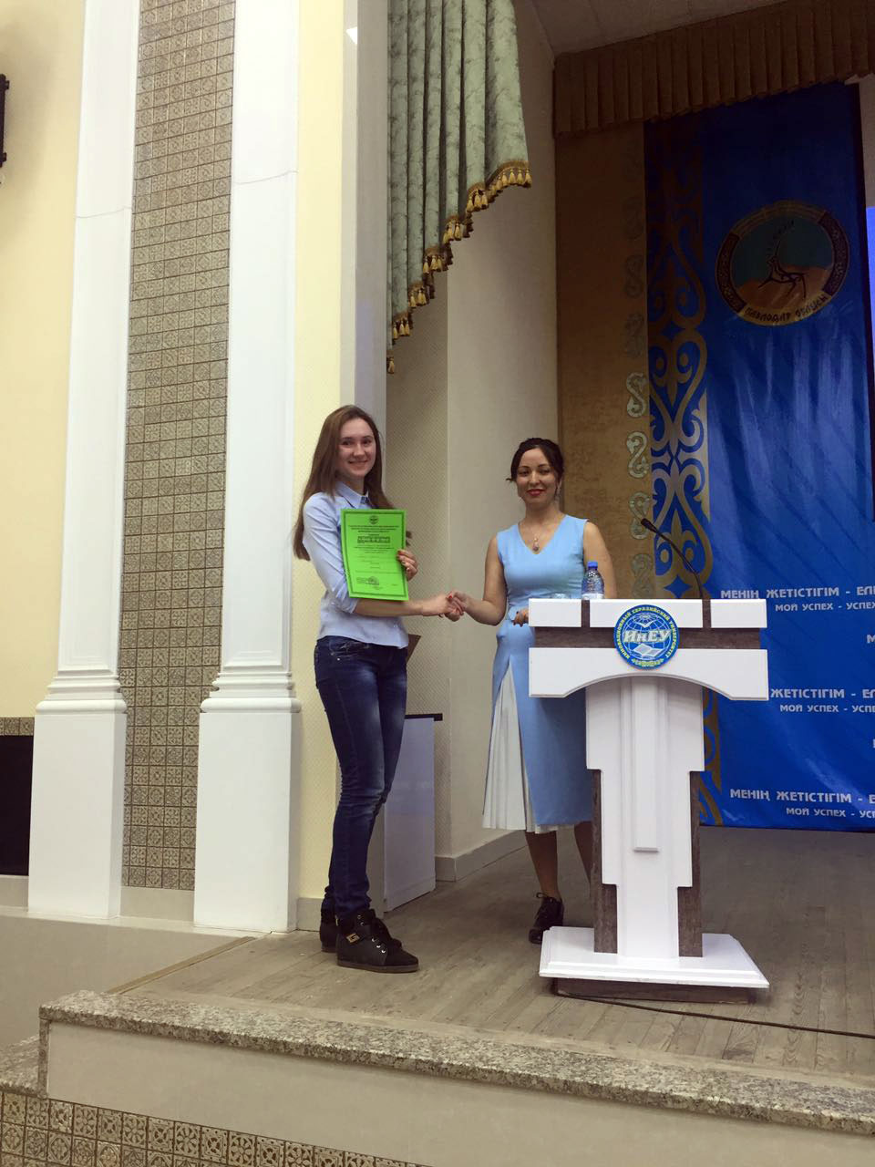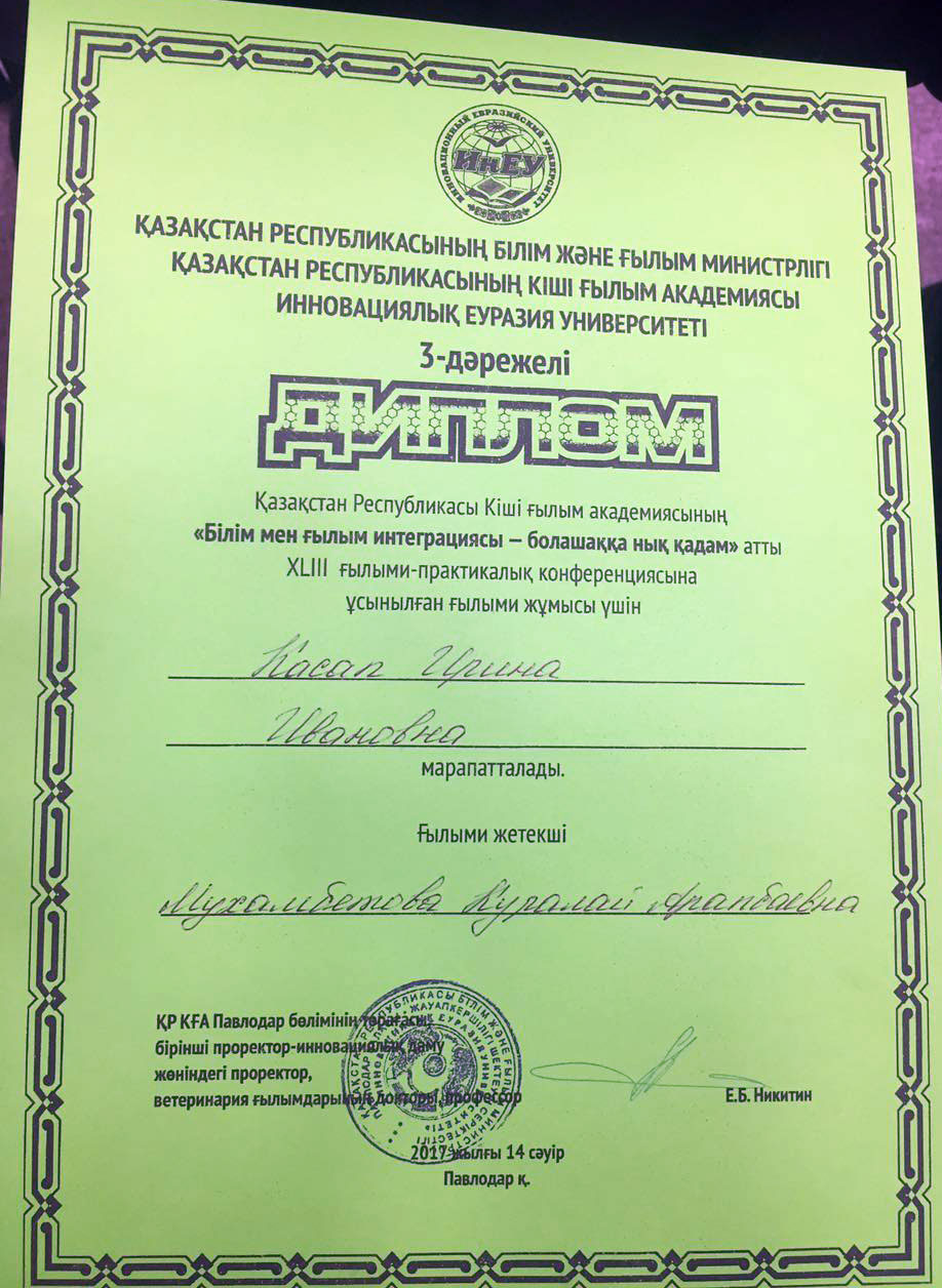 The teaching staff of the Eurasian Humanities Institute congratulate the participants of the XVIII-th scientific –practical conference: “Integration of education and science is a step forward to the future”, held in Pavlodar by the Pavlodar department of the Maly Academy of Sciences of the Republic of Kazakhstan together with the Innovational Eurasian University on the victory: Snegurskaya Valentina – Diploma of the 1-st degree (scientific supervisor: CPSc., Docent Ospanova Ya.N.), Amangheldinova Botagoz – Diploma of the 1-st degree (scientific supervisor: MSSc, senior teacher Ayazbayeva A.T.), Islyamova Aisulu – Diploma of the 2-nd degree (scientific supervisor: senior teacher Tobagabylova I.A.), Boribay Aizhan – Diploma of the 2-nd degree (scientific supervisor: Ayazbayeva A.T.), Kassap Irina – Diploma of the 3-rd degree (scientific supervisor: CSSc, Docent Muhambetova K.A.).