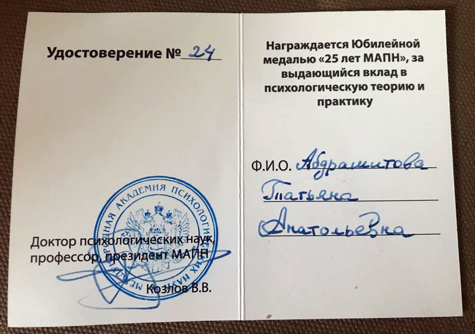 The Departmet of Pedagogy congratulate the Doctor of Psychological Science, Professor T.A. Abdrashitova on be4ing awarded with the Jubilee medal “25 years of the International academy of Psychological Science” for the prominent contribution to the psychological theory and practice.