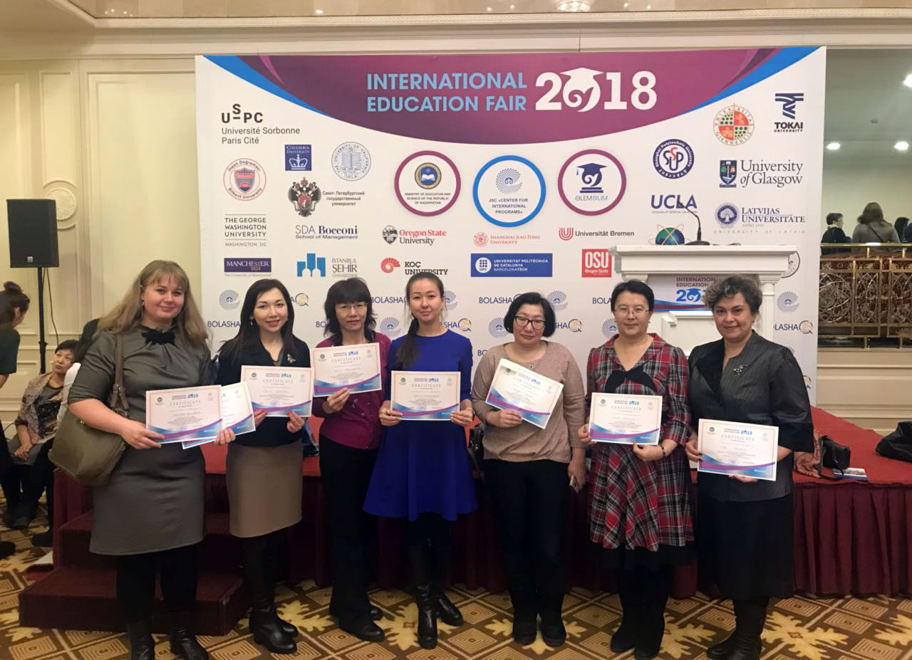 On 20-21January 2018 the teachers of the Department of foreign languages of EAGI (Doldinova S.A., Dyachenko O.V., Umbetova K.E., Ivchenko L.V., Demidkova N.I., Temirgaliyeva G.K., Altymbayeva A.K., Moldabekova A.M.) visited the international educational exhibition «International Education Fair 2018», organized by the Ministry of education and science of RK and “The Centre of international programmes”. The teachers took an active part in the work of seminars and trainings held in different places of the exhibition. All the participants were awarded with certificates.