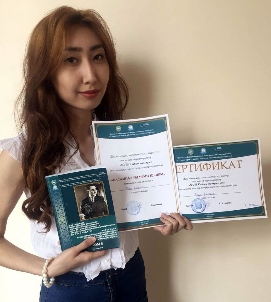 For her report “Modern approaches to the determination of drugs addiction: review of the main factors of the adolescents” Aisulu was rewarded with the certificate «Жасампаз ғылыми шешім» («Creative scientific solution»). Her report is included in the collection of the conference materials.