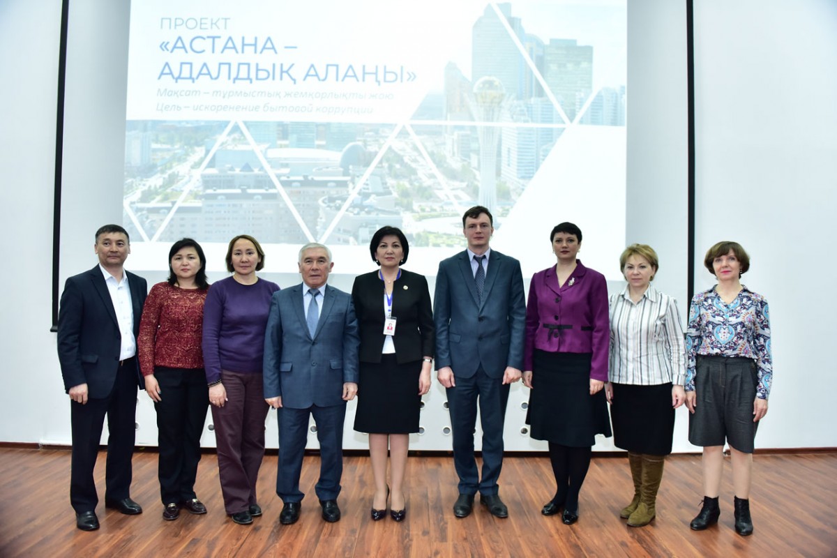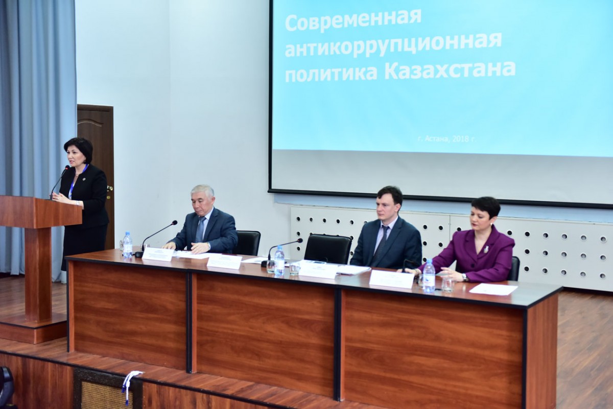 On 4 may 2018 in the Eurasian Humanities Institute there was held a meeting of the students, the teaching staff and administration with the Deputy Head of the department on the affairs of the state service and opposition against corruption on astana-city Zhalkyshiyeva Zhazira Zhaksylykovna (the leader of the project «Астана адалдық алаңы»), the deputy of the Head of the Headquarters (Department) of the Department of the National Bureau on the opposition against corruption in Astana Boiko Igor Alexandrovich. At this meeting Prorector on the educational work, Candidate of Pedagogical Science, Professor Ospanova Yaroslava Nilkolayevna made a speech. In the course of the event the issues concerning the realization of the union policy in the sphere of the state service, opposition against corruption and control over the quality of rendering services were discussed.