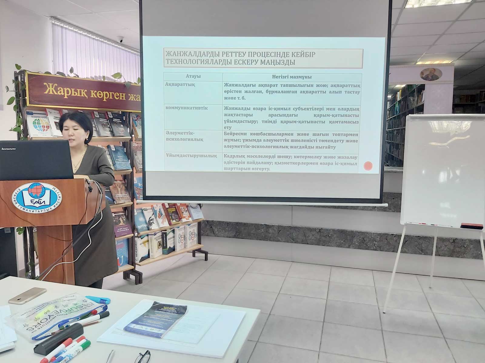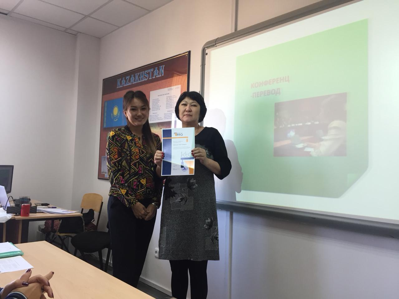From 24 September till 5 October 2018 the teachers of the Department of foreign languages were being retrained at the Refresher Course which was organized according to the agreement about collaboration between EAGI and the Kazakh Academy of translation/interpretation and also “the Association of professional translators and translation companies of Kazakhstan”. The Course was conducted by the Director of the Academy of translation/interpretation Aknur Toleubayeva and the partners of IE “Gala Translations” Aliyeva Kulshan and Loyenko Anna. For the listeners of the Course there were conducted practical master-classes at which there were demonstrated new achievements in the field of translation activity. On the completion of the Course the listeners were given certificates.