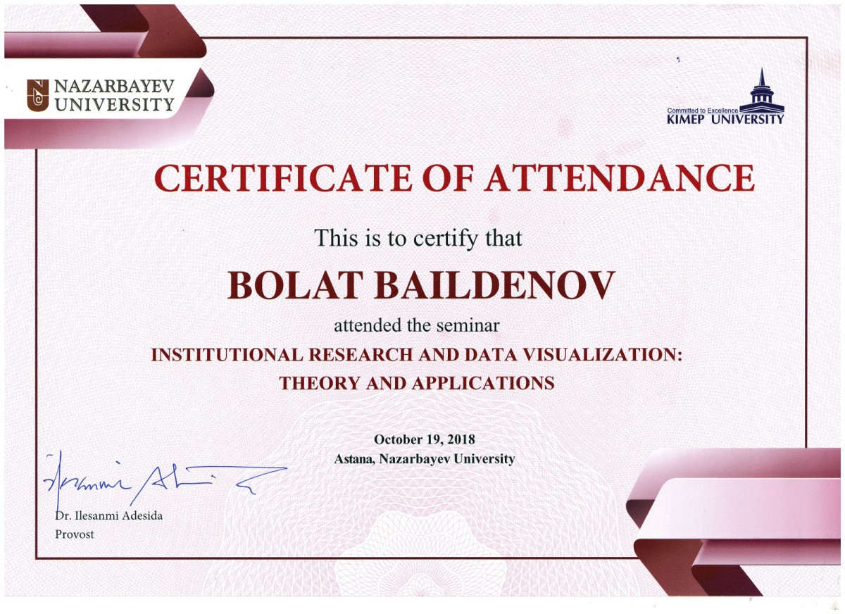 On 18 October 2018 the Head of the Department of monitoring of the quality of the educational process of EAGI Baildenov B.T. took part at the seminar: “Institutional researches and visualization of the data: theoretical and applied aspects” which was held at Nazarbayev University. At the seminar there were discussed the urgent issues of the institutional researches on determining strategic directions of the development of higher educational establishments, practical implication of computer programs and supplements in the sphere of institutional researches and also the aim, function and structure of institutional researches.