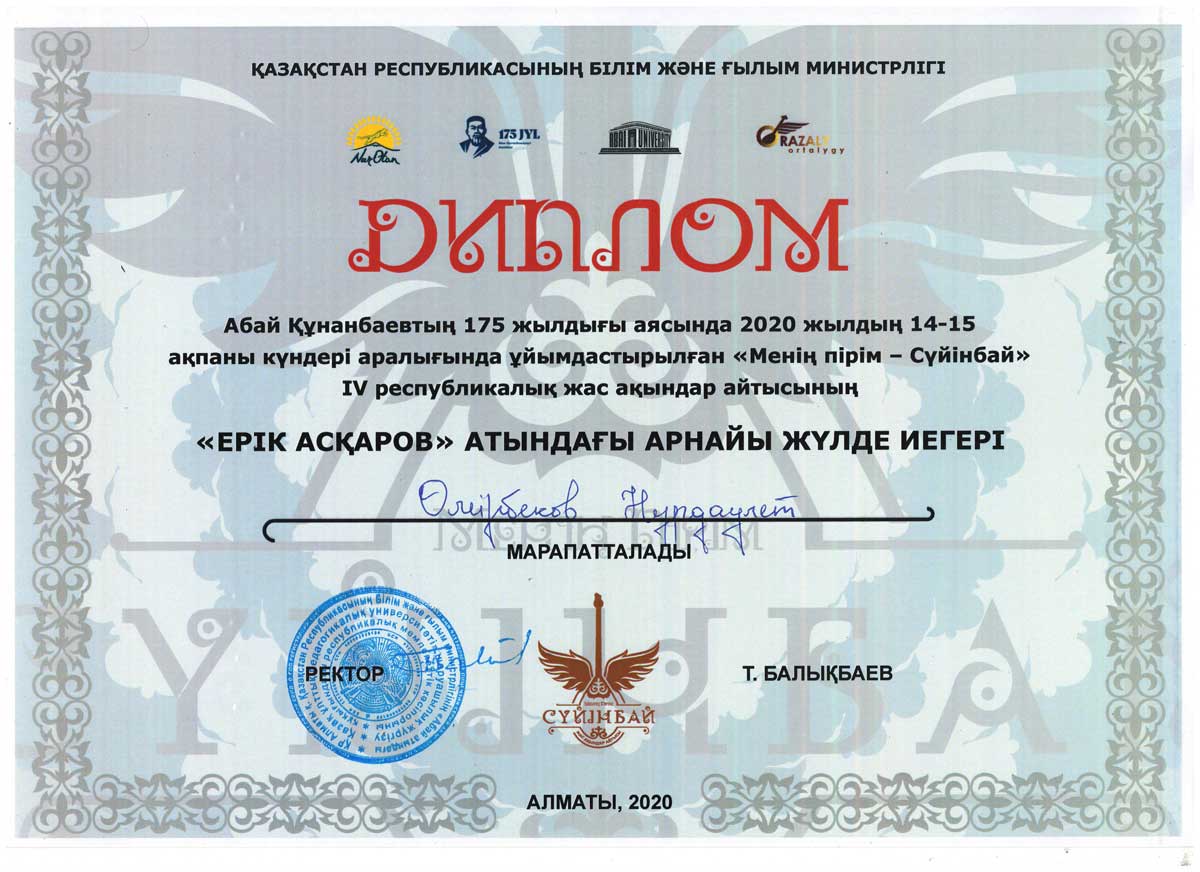 Within the 175-th anniversary of Abay Kunanbayev the student of the educational program “The Kazakh Language and Literature” of the Eurasian Humanities Institute Omirbek Nurdaulet became the holder of a special prize “Erik Askarov” at the Republican aitys of young akyns «Менің пірім Сүйінбай» organized on 14-15 February 2020 in Almaty city.