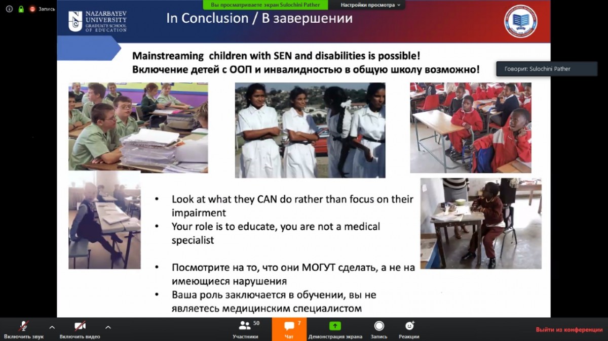 At the webinar the speakers showed interesting and useful presentations and shared information. We express our gratitude to the organizers of the Higher school of education Nazarbayev University and the lecturer Sulochini Pather PhD in the field of inclusive education.