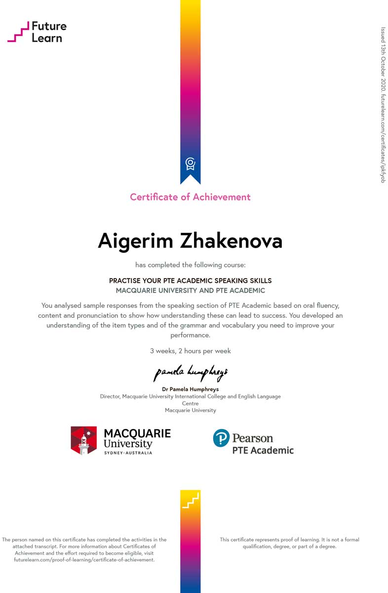 In October 2020 Docent of the Department of foreign laguages G.U. Arenova, the senior teacher A.M. Sarsenova and also the students of the graduation courses did the language on-line courses «Practise your PTE Academic Speaking Skills”, developed by the Australian Macquarie University, Sydney and also «Introduction to business management» under King’s College, London. These courses were developed in order to enhance the language competence, to activate the speaking skills and learn the key aspects of managing business.The continuity of the courses are from two to four weeks depending on the chosen theme. The courses may be done at any convenient time. All the participants of the courses obtained a lot of experience of communicating with the teachers and students of the leading universities of Europe. On having completed the courses the participants were awarded with electronic certificates.
