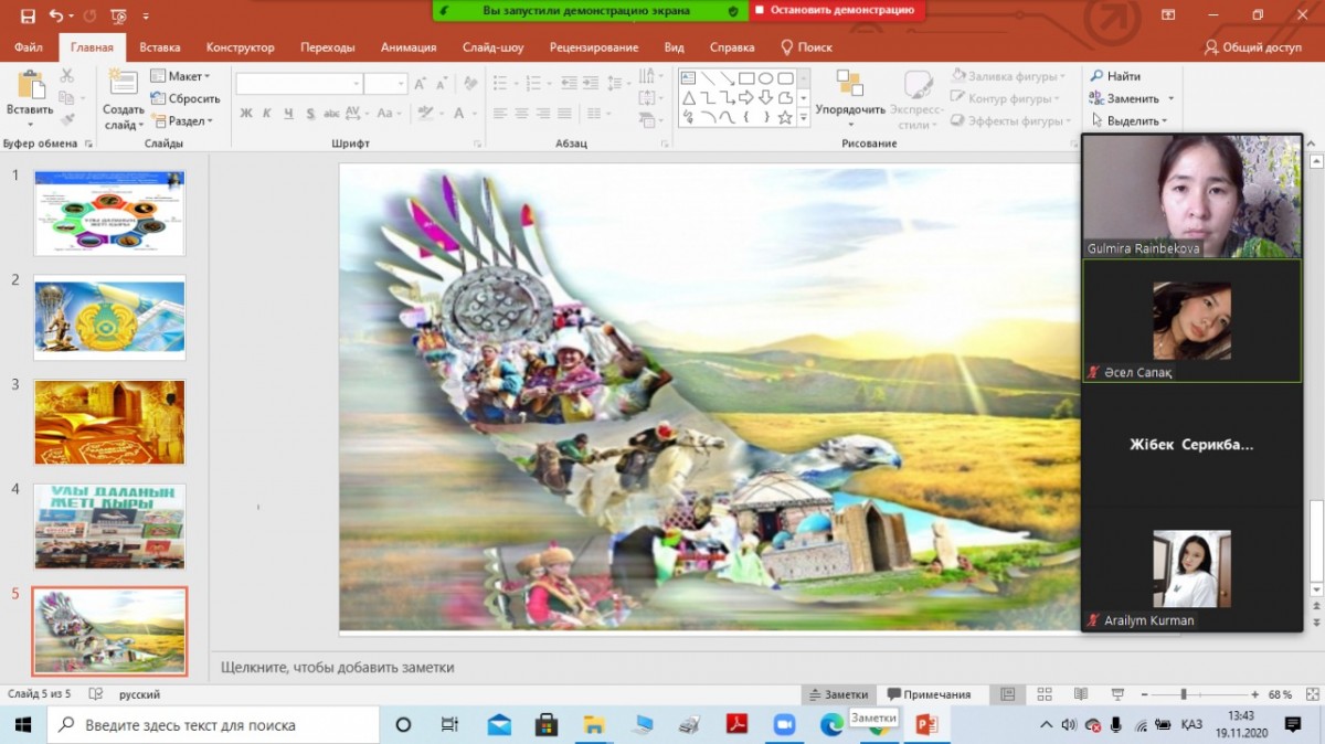 On 19-th November 2020 the senior teacher of the Department of the Kazakh and Russian Philology, Master of Science G.S. Rainbekova and the students of group ҚТ-20-01 watched and discussed the documentary film “7 faces of Independence: way to modernization” devoted to the Day of Independence of RK and the Day of the First President of RK. They expressed their opinions about the Day of Independence of RK, about the country with deep history which became a young sovereign country of modernity.