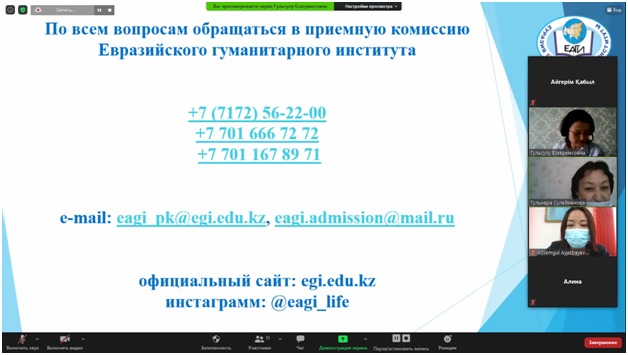 The career guidance on-line seminar was opened by the Deputy Head of the Department of Pedagogy, Docent Ayazbayeva A.T. The teaching staff of the Department: Docent Suleymenova G.B., the senior teachers: Tobagabylova I.A., Bolatbekova N.Zh. gave the graduates of 2021 full information about each specialty of the Eurasian Humanities Institute. The activity of the student clubs, functioning at the Department of Pedagogy: «Асыл жүрек», «Инсайт», «Зерек бала» was covered in detail.