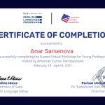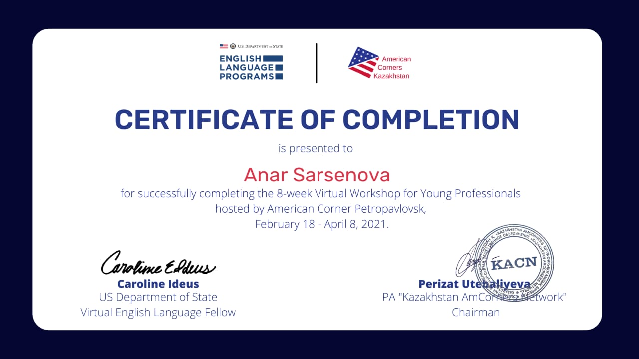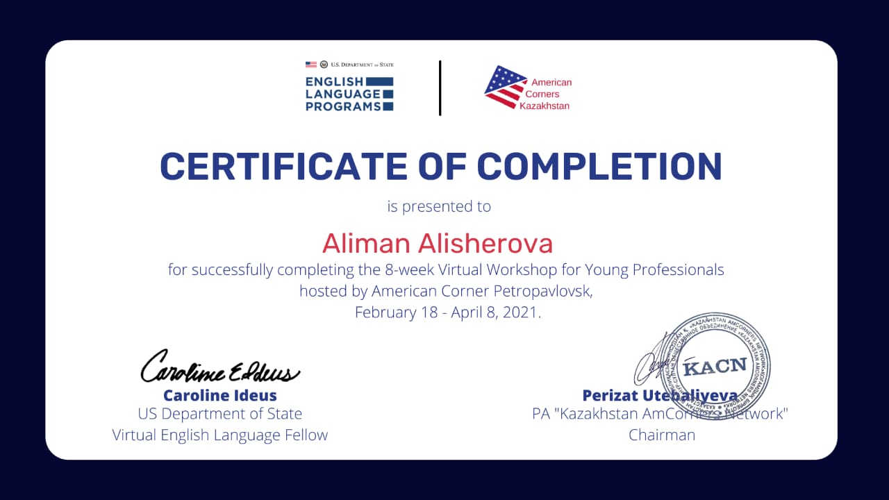 From February 18 to April 8, 2021 the students of group ИЯ-18-01 Shakhmanova A. and Alisherova A. took part in the work of the eight-week «Virtual Workshop» of the American Corner Petropavlovsk under the supervision of the M.P.Sc., the senior teacher Sarsenova A.M.. The participants were given certificates.