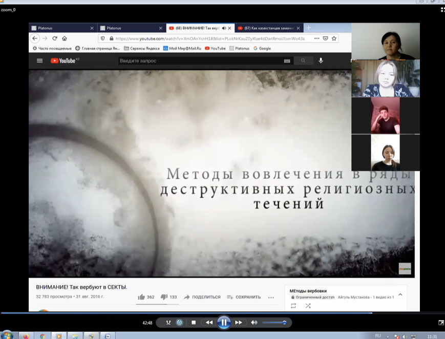 On 15 April 2021 the senior teacher Mustakova A.Zh. conducted an open lesson “Religion Studies” in group ПП-20-01 on the theme: “Sects and sectarian movement in Kazakhstan” aimed at developing the ideas about sects and sectarian movement within the prevention of extremism and terrorism. At the lesson the main aspects of the law of RK “About the religious activity and religious associations” (with changes and amendments for 15 November 2020) and the video for acquaintance: “How the Kazakhstani are involved in sects”, “Ways of attracting to sects” were demonstrated.