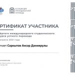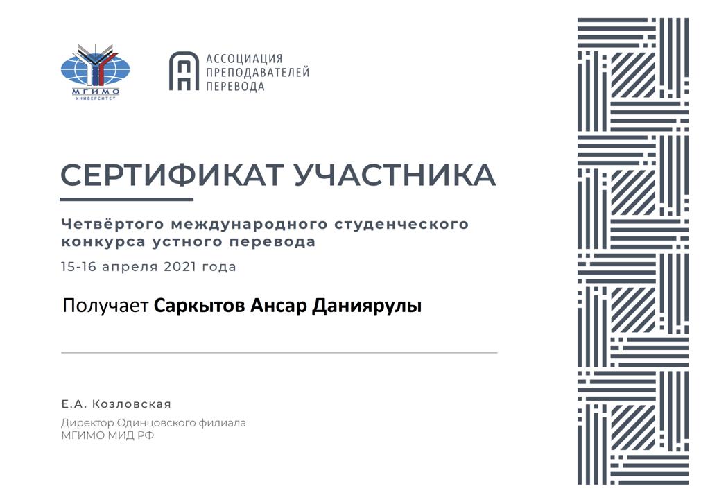 On 15-16 April 2021 the students of group ИЯ-18-01 Sarkytov A., Shakhmanova A., the student of group ПД-18-01 Dyussembayev B. took part in the Fourth International Student Competition of interpretation and were awarded certificates.