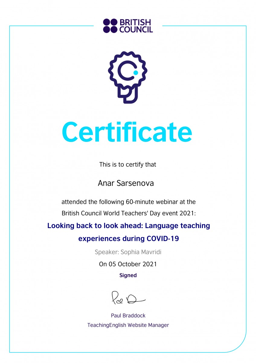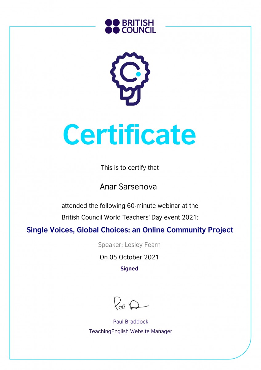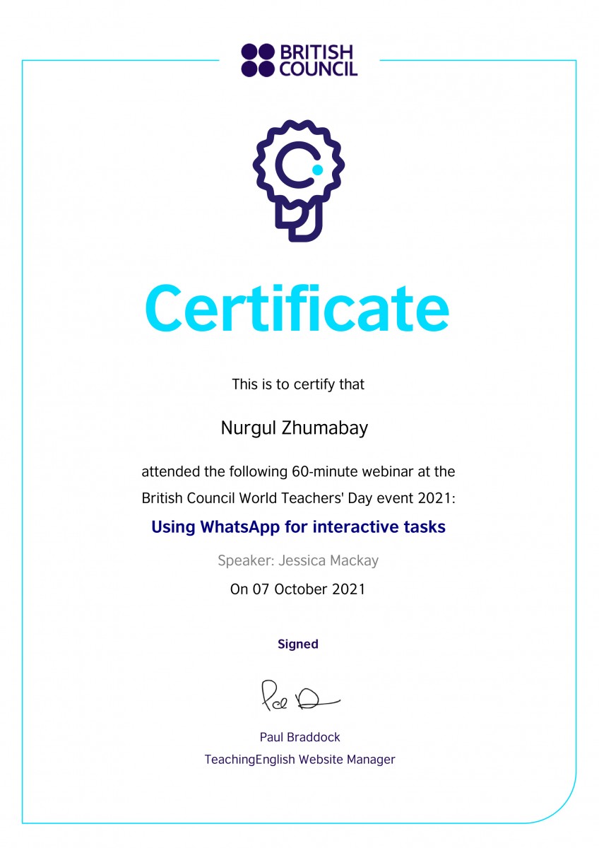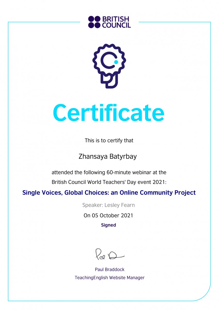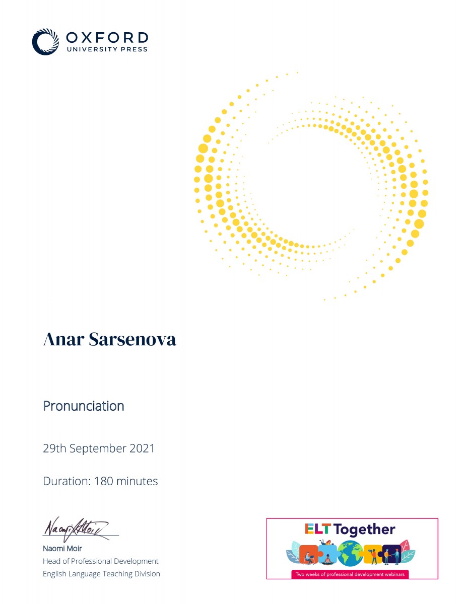 From September 27 to October 8, 2021, students of group ИЯк-18-02 of the Department of Foreign Languages under the guidance of senior lecturer Sarsenova Anar Madibekovna took part in the following webinars. Such as “Assessment for learning”“ “Pronunciation”, ”Literature and Extensive Reading”, from Oxford University Press, Tony Green and Paul Woodfall, as well as the British Council, Joe Dale – “Quizzing tools, retrieval practice and multi – modal feedback in language lessons”. In accordance with the requirements of the XXstI century, students study not only within the walls of the institute, but also strive for international education. At the end of the webinars, the students were awarded certificates.