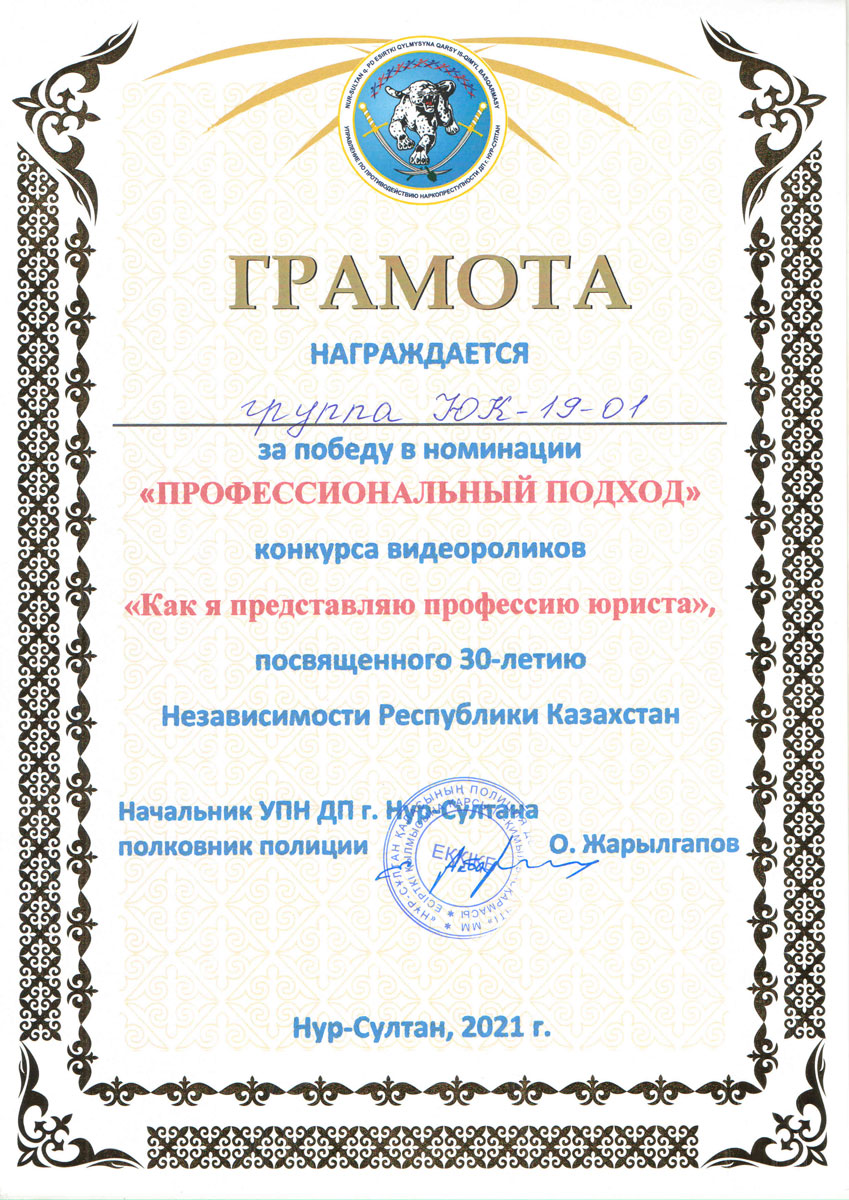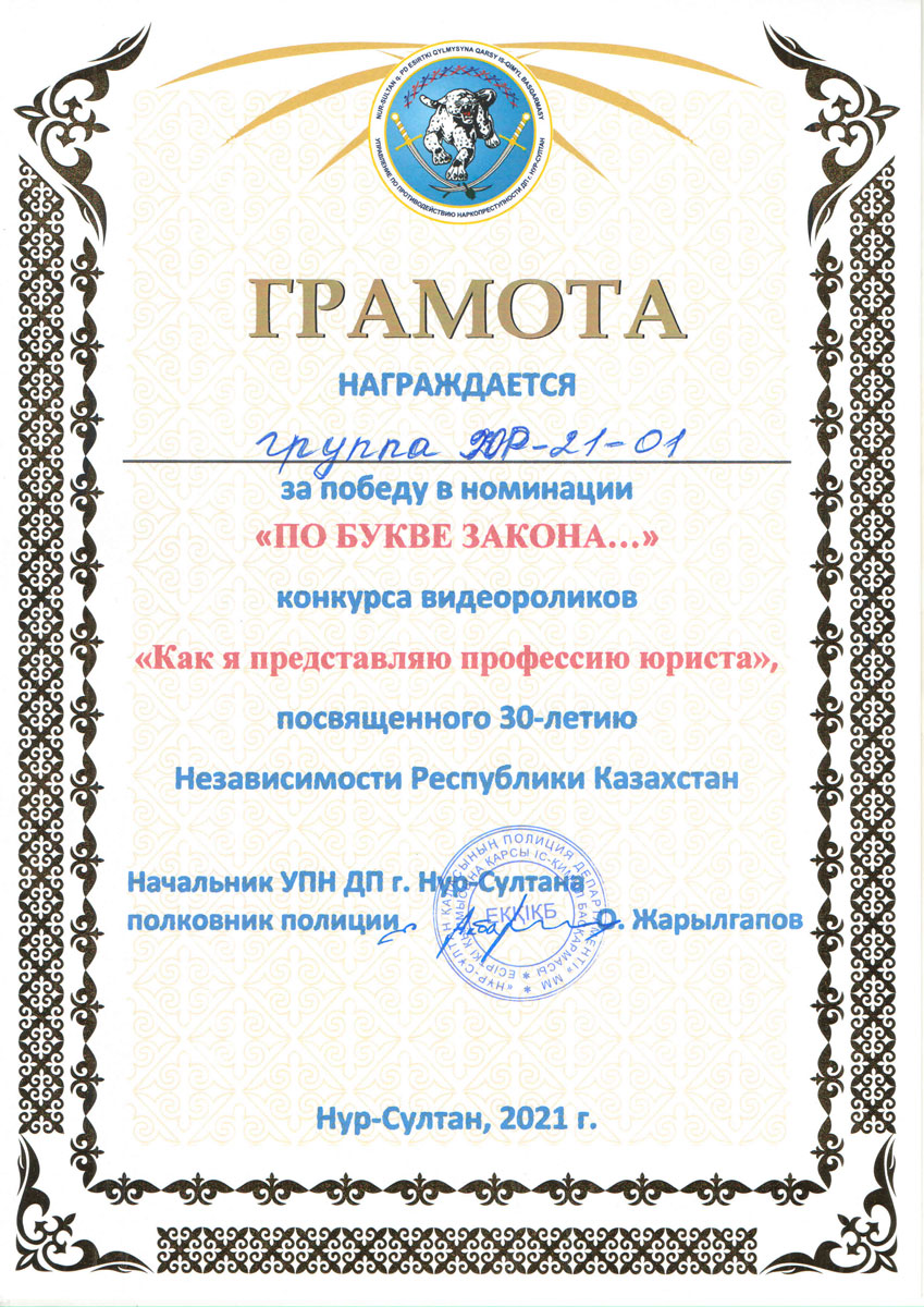 “The best information video” – group YuҚ-21-01. “The best creative approach” – Imashev Meiram, student of group YUR-19-01. “Best Creative Idea” – Dauren Anel, student of group YR-19-01. “Best script” – group YR-18-01, group YR-18-02. “Best camera work” – Bekenov Duman, student of group YURT-20-01. “Professional approach” – group YuҚ-19-01. “By the letter of the law …” – group YR-21-01.
