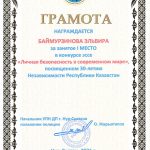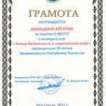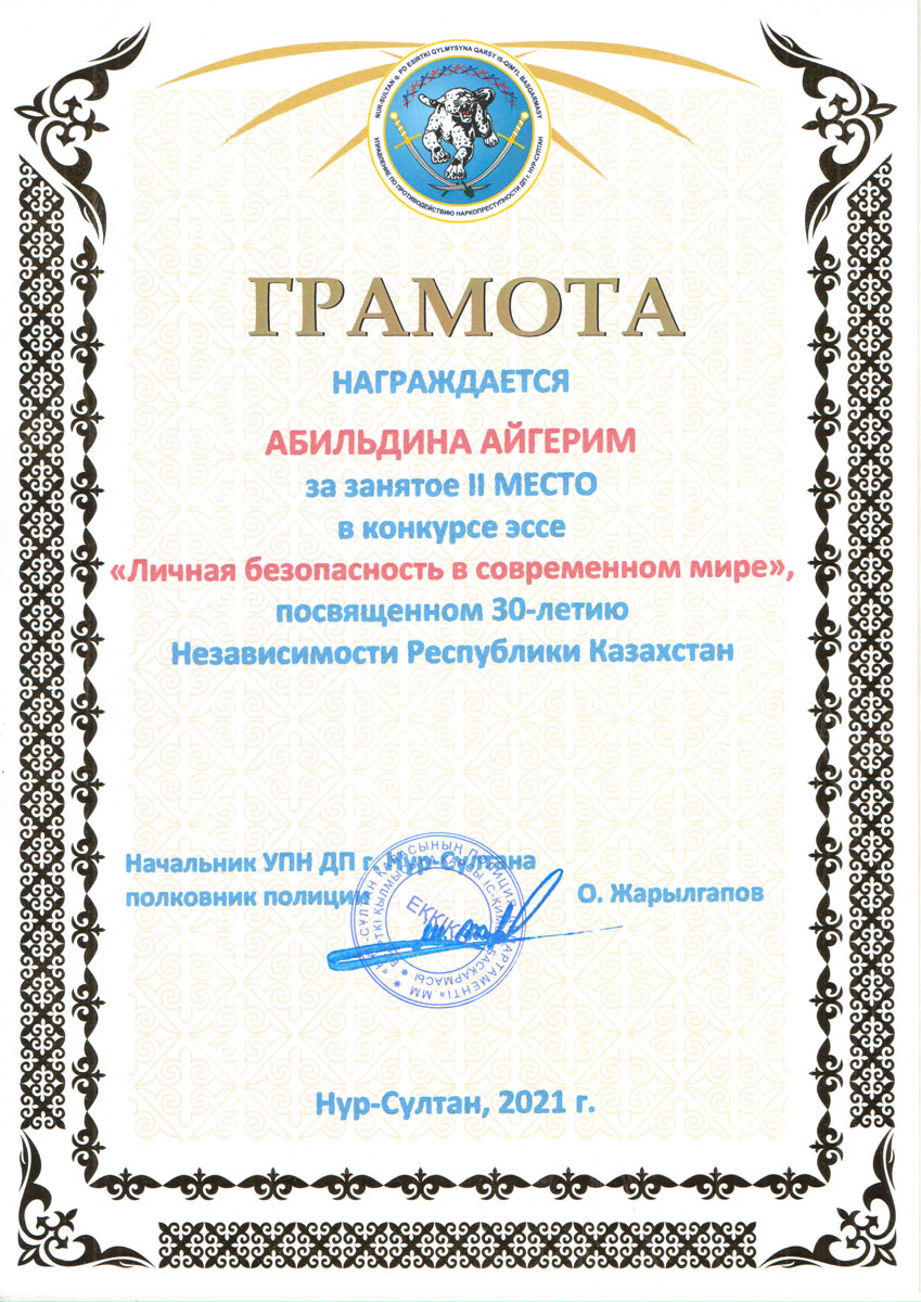 From 4 to 20 October 2021, an essay competition on the topic “Personal security in the modern world” was held at the Eurasian Humanitarian Institute, dedicated to the 30th anniversary of the Independence of the Republic of Kazakhstan,which was organized jointly with the Office for Combating Drug Crimes of the Police Department of Nur-Sultan. The competition was attended by students of the educational program “Jurisprudence”.