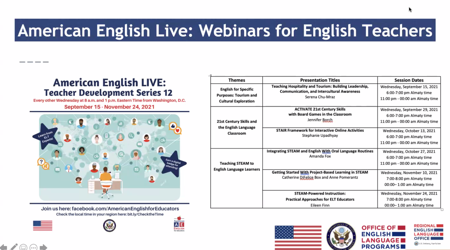 On November 4, 2021, the training webinar for teaching staff of the Department of Foreign Languages was held. It was conducted by John Silver – Regional English Language Officer for Central Asia and Gaukhar Shakirova – Regional English Language Coordinator.