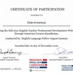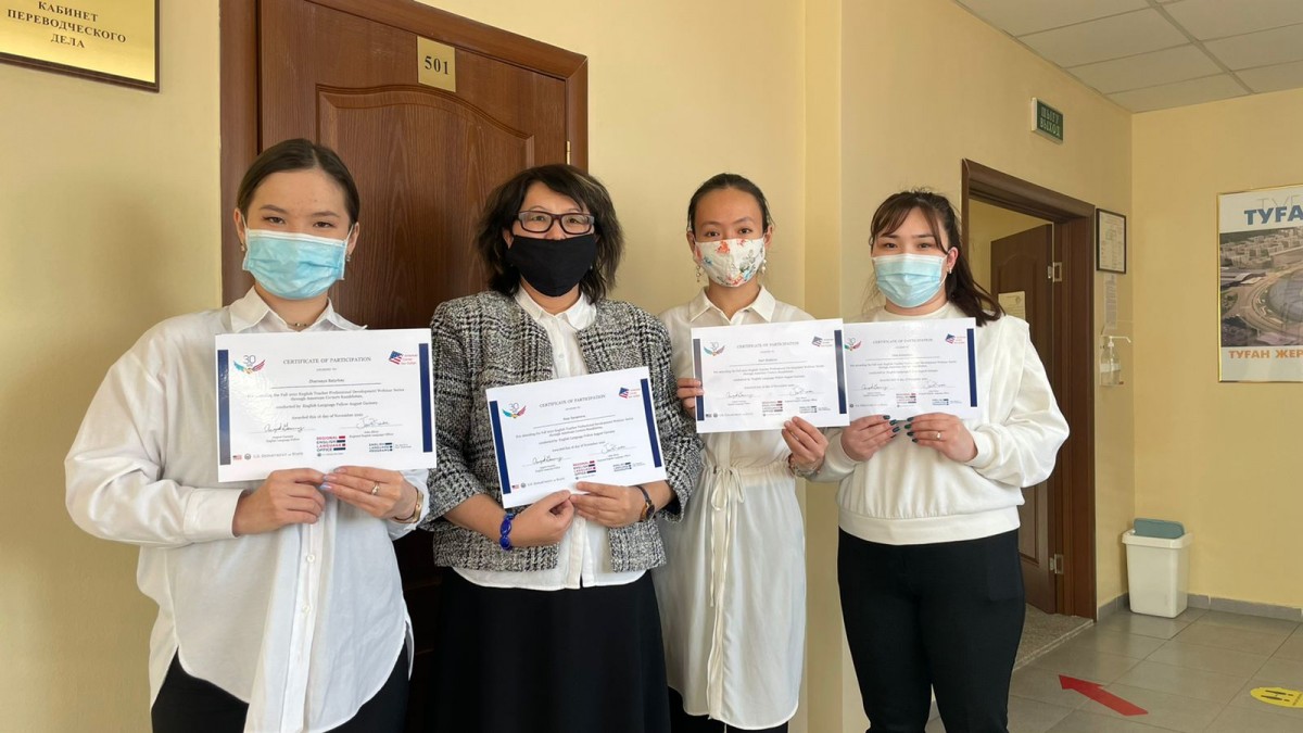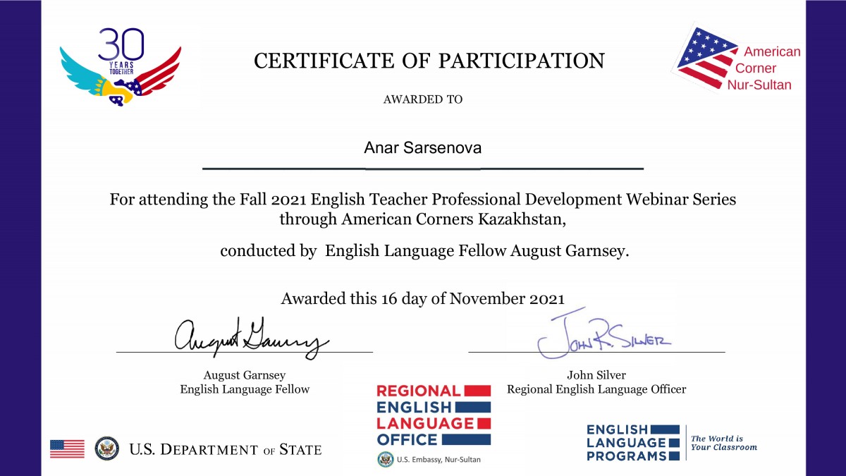 From October 5 to November 16, m.p.sc., senior teacher Sarsenova A.M., m.p.sc., docent Davletova S.E. and students of the academic group IYAK-18-02 Ulzhan Kukieva, Armankyzy Dilda, Batyrbay Zhansaya and Bolatova Ayim took part in the series of webinars on professional development of English language teachers through the American corner Nur-Sultan, organized with the support of the US Embassy in Kazakhstan. The webinars were led by August Garnsey (English Language Fellow Nur-Sultan, Kazakhstan U.S. Department of State, English Language Programs). All seminar participants received certificates.