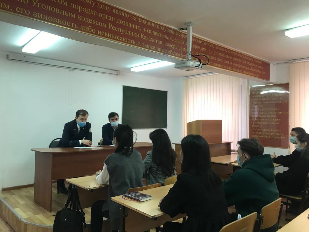 On November 26, 2021 the Department of Legal Disciplines, the Student Parliament, together with the Department of Justice of the city of Nur-Sultan, organized a guest lecture on the topic: “Confiscation of property by judicial acts.” as part of the plan for conducting guest lectures for students of the educational program “Jurisprudence” (academic groups YUR-18-01, YUR-18-02, YURT-19-01, YUK-18-021, YUK-18-02). The lecture was delivered by the senior bailiff of the Department of Justice of the city of Nur-Sultan A.E. Lesbekov.
