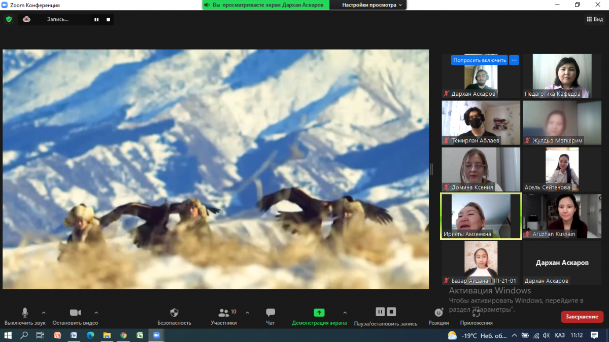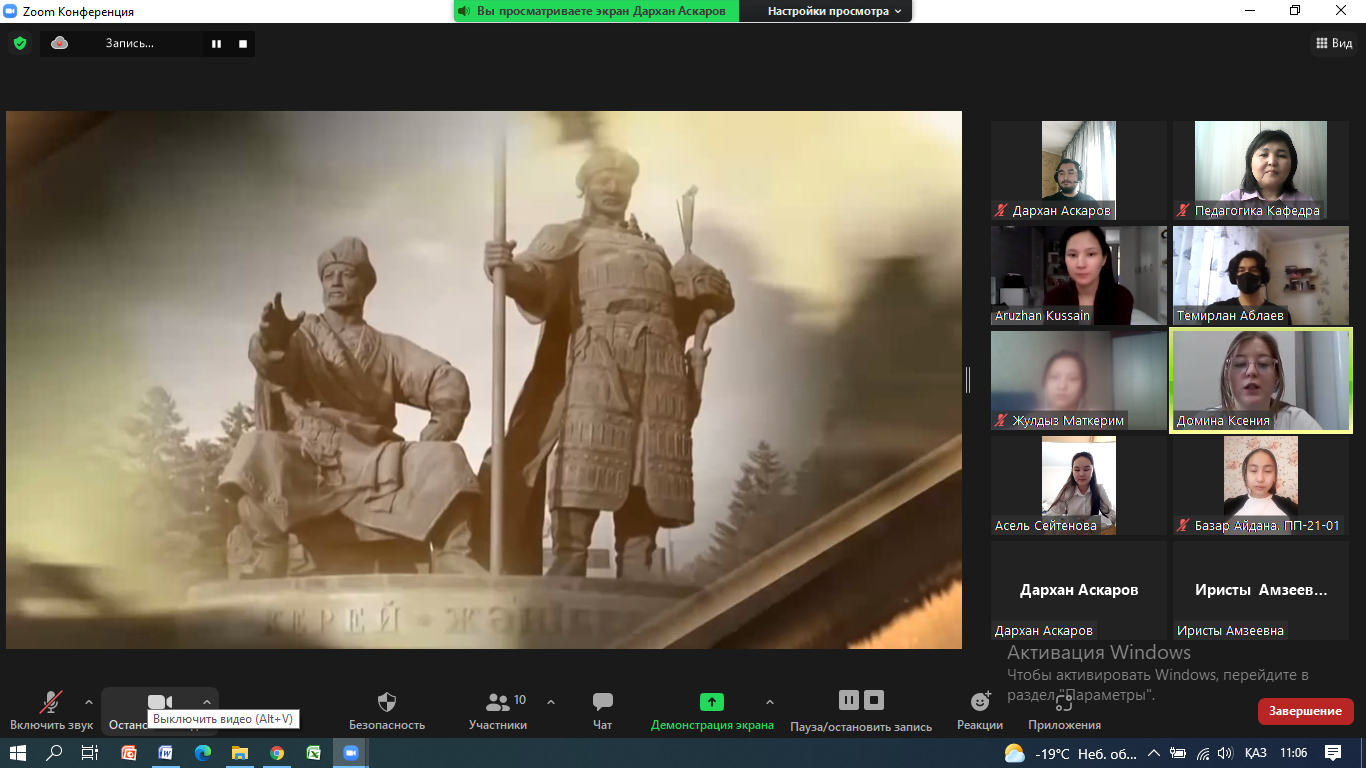 December 14, 2021 curator Rakhimzhanova G.Zh. held curatorial hour in online format on the topic “30 years of Independence of the Republic of Kazakhstan” for 1st year students of the educational program “Pedagogy and Psychology” (academic group PP-21-01). The purpose of this event is to instill patriotic feelings for their homeland, sense of civic duty and responsibility for the future.