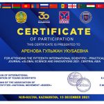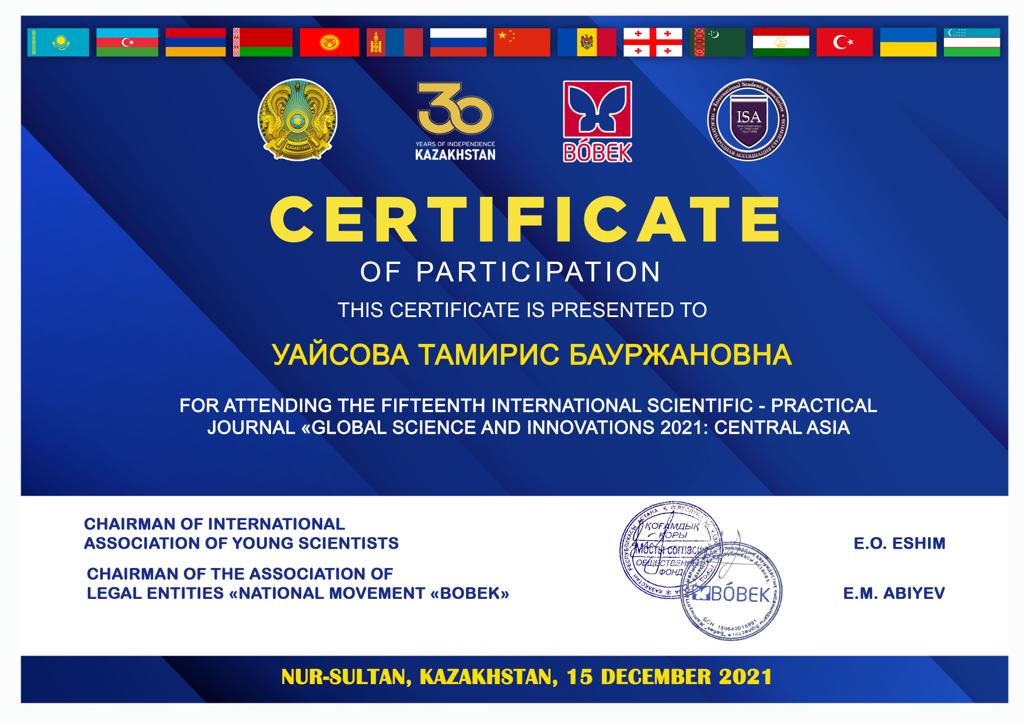 On December 15, 2021 teachers of the Department of Foreign Languages, m.p.sc., Docent Arenova G.U., m.ph.sc., senior teacher Melnova K.V. and students of the academic group PDT-19-01, Gabdullova Dina and Uaisova Tamiris took part in the XV International Scientific and Practical Conference “Global Science and Innovations 2021: Central Asia” in absentia. At the end of the event, the participants received certificates.