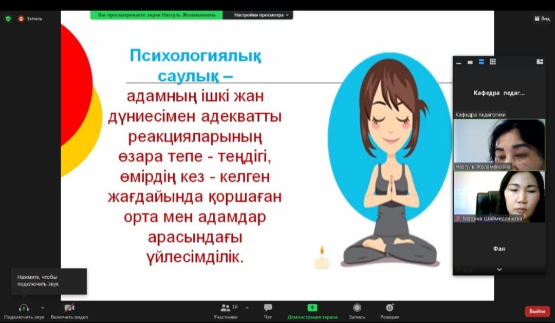 On December 24, 2021, the psychologist of the Eurasian Humanities Institute Bolatbekova N.Zh. conducted training seminar on the topic “Psychological health of teachers”. The teachers of the “Polytechnic College” of Nur-Sultan and the teachers of the institute took part in the event within the framework of mutual cooperation.