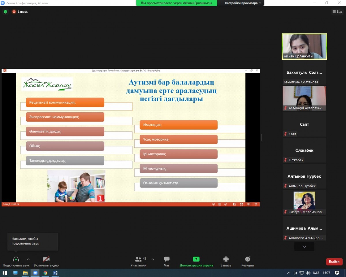 On February 17, 2022 as part of the study of the discipline “Inclusive Education”, the head of the club “Asyl Zhurek” Ayazbayeva A.T. organized meeting for students of educational programs 6B01102 – “Pedagogy and Psychology”, 6B01303 – “Pedagogy and methods of primary education”, 6B01606 – “History” and 6B01205 – “Preschool education” with Boribay Aizhan Erlankyzy, teacher-psychologist of the Center for children with autism, who presented practical experience of working with children with autism. The students showed interest in children with ASD and to corrective methods they learned during the master class.