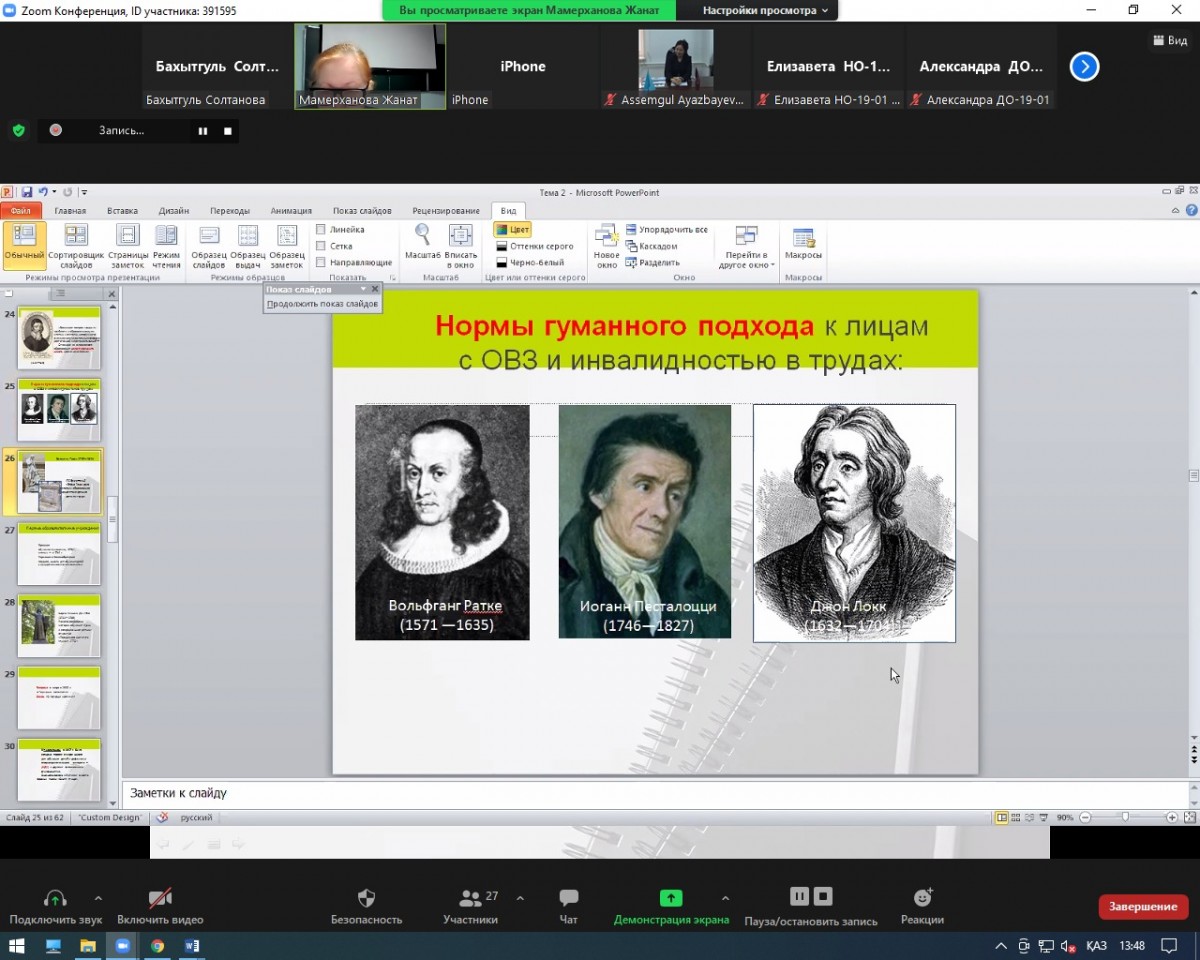Candidate of Pedagogical Sciences, Docent of the Academy “Bolashaq” (Karaganda) Mamerkhanova Zhanat Mukhamedkhanovna, implementing the program of academic mobility, gave lecture on the topic: “The history of the emergence and development of inclusive education” within the discipline “Inclusive education” for students of the 3rd course of the educational program “Pedagogy and methods of primary education” and the educational program “Preschool education” of the Eurasian Humanities Institute. The lecturer revealed the historical aspect of changing the attitude of society towards people with special educational needs.