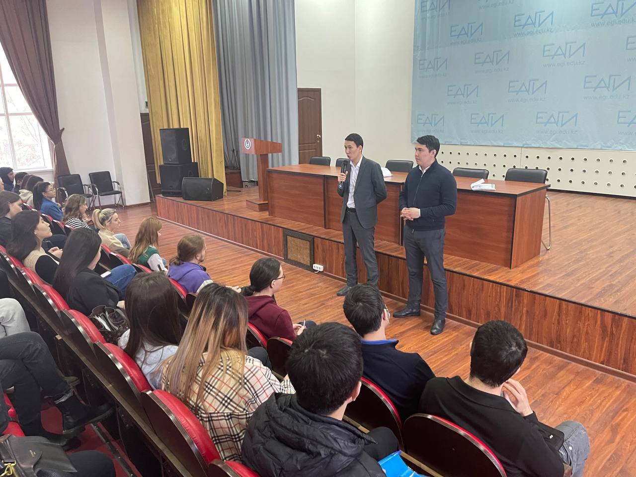 On March 28, 2022, students of the Eurasian Humanities Institute took part in the “Clean Session” action, which was organized by activists of the youth wing of “Jas Otan” under the AMANAT party. Magzum Arslanbek, the first deputy chairman of the youth wing of the capital branch of Jas Otan, told the students about the goals and objectives of the action and noted that this action is being held in the universities of the republic as part of the anti-corruption policy of the AMANAT party in order to strengthen the fight against corruption in higher educational institutions.