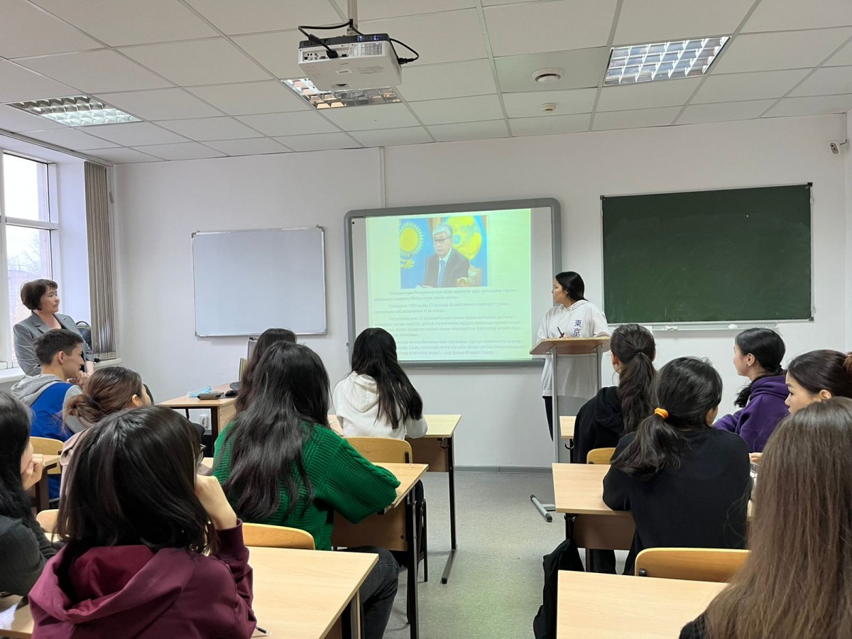 On October 22, 2022, senior lecturer of the Department of Foreign Languages, curator of the academic group ShT-22-02 Sadvokassova M. G. held curatorial hour dedicated to the Day of the Republic of Kazakhstan on the topic: “Menin Otanym – Kazakhstan”. Students of the group made reports and presentations. All participants of the event were active and showed genuine interest in the discussed issues.