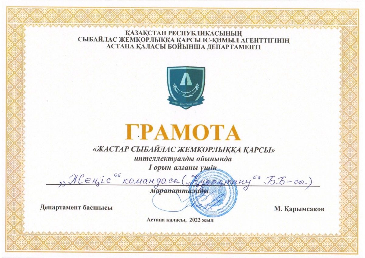 All the winners and prize-winners, as well as the organizers of the intellectual game – the chairman of the CYA, the President of the Student Parliament Abildina Aigerim (academic group YuK-19-01) and the chairman of the student anti-corruption club “Sanaly Urpak” Salimzhuarov Gani (academic group YuR-20-01) were awarded diplomas, letters of thanks from the Department of the Anti-Corruption Agency of the Republic of Kazakhstan in Astana and prizes from the Office for Combating Drug Crime of the Police Department of Astana.