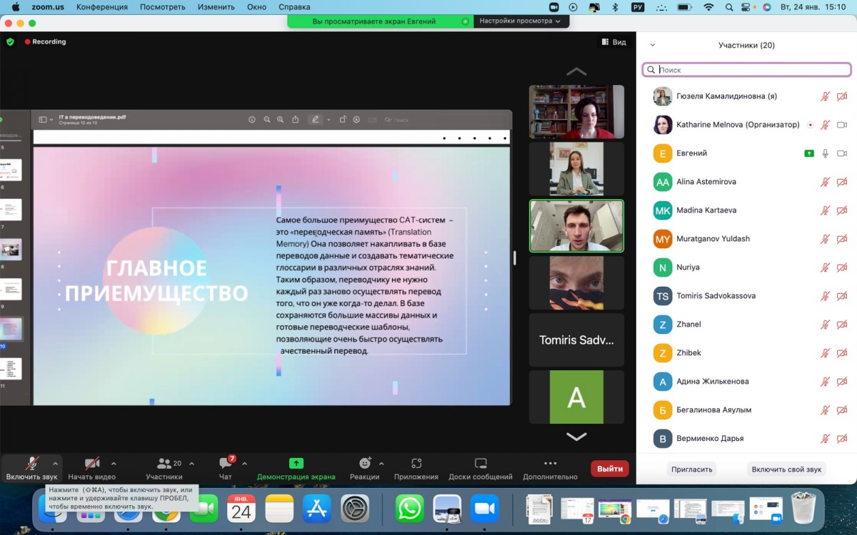 On January 24, 2023, the training seminar “Using IT technologies in the field of translation studies” was held in online format for 2nd year students of the educational program 6В02307 – “Translation Major” at the Department of Foreign Languages. The speaker was graduate of the Eurasian Humanities Institute E. A. Bocharov. Evgeniy Aleksandrovich spoke about the use of IT technologies, both in translation and interpreting, provided the list of online RSI translation platforms, and also spoke in detail about the advantages of CAT systems in the work of a translator. At the end of the speech, the students asked their questions and received comprehensive answers from a professional.