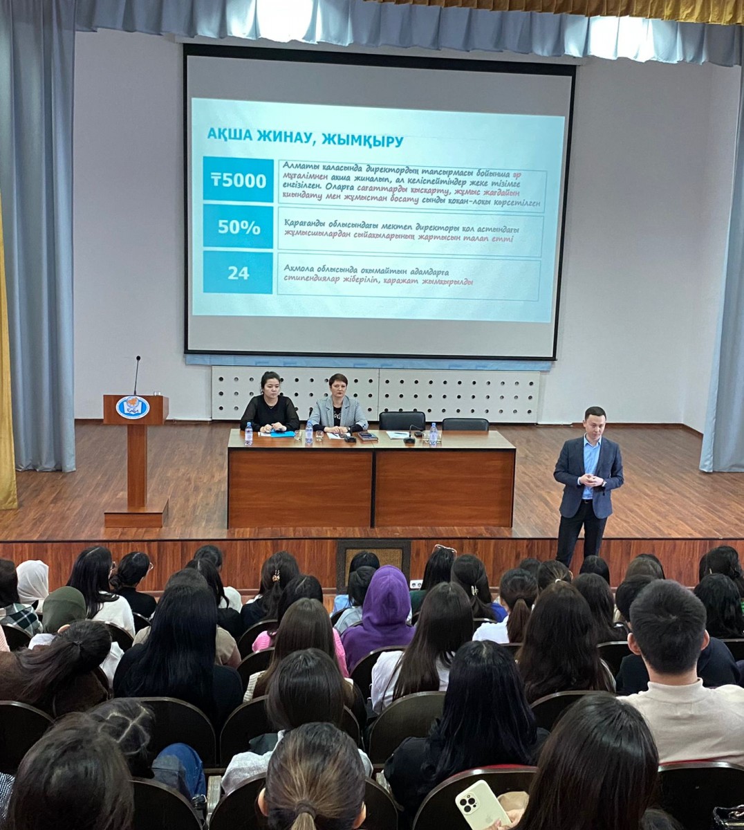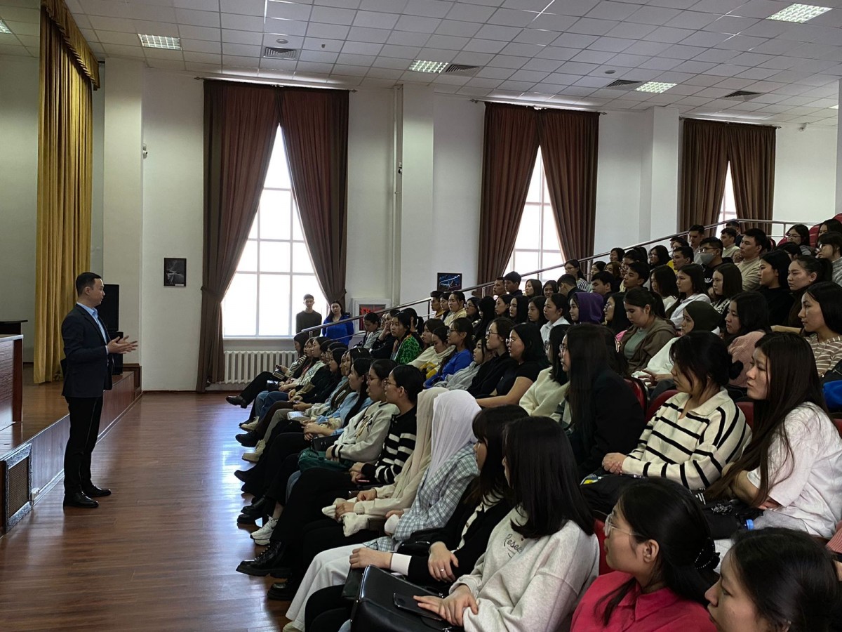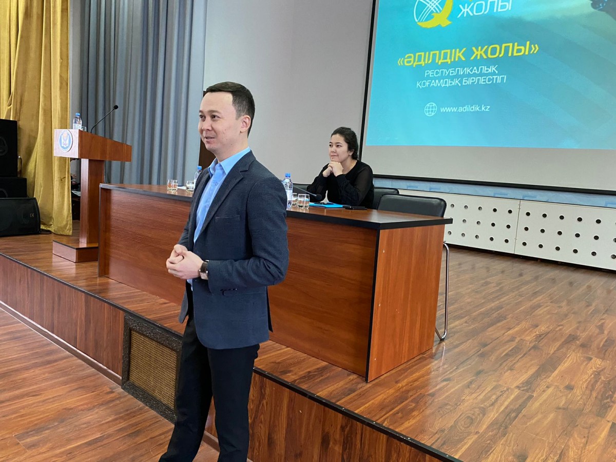 The vice-rector for educational work, candidate of pedagogical sciences, professor Ospanova Ya. N. addressed the audience with a welcoming speech. Further, the students were addressed by: chief specialist of the prevention department of the Anti-Corruption Department in Astana Ansaganova A. A.; Deputy Executive Director of NGO “Adildik Zholy” Kondybaev A.K.