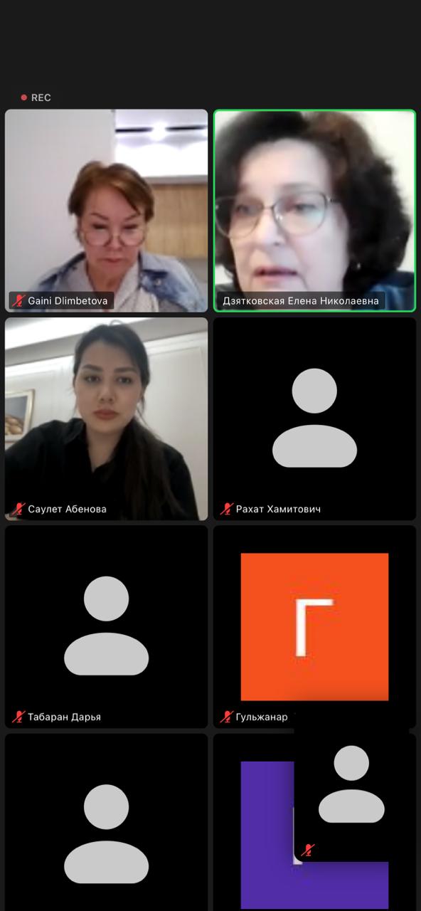 On March 24, 2023 Vice-Rector for Educational Affairs, Professor Ospanova Ya.N., Doctor of Philosophy (PhD), Docent of the Department of Foreign Languages Ospanova Zh.T., member of the EAGI Alumni Association, postgraduate student of Moscow State University named after M.V. Lomonosov Akimish D. took part in webinar on the topic: “Designing the content of environmental education in “green” school: problems and solutions” within the framework of the IRN project AP14869631 “Model” green school – green college – green university “as a system for the development of green education” . The speaker was international expert in environmental education, Doctor of Biological Sciences, Professor, VNS of the Laboratory of Didactics and Philosophy of Education, Head of the UNESCO Network Chair Dzyatkovskaya E.N.