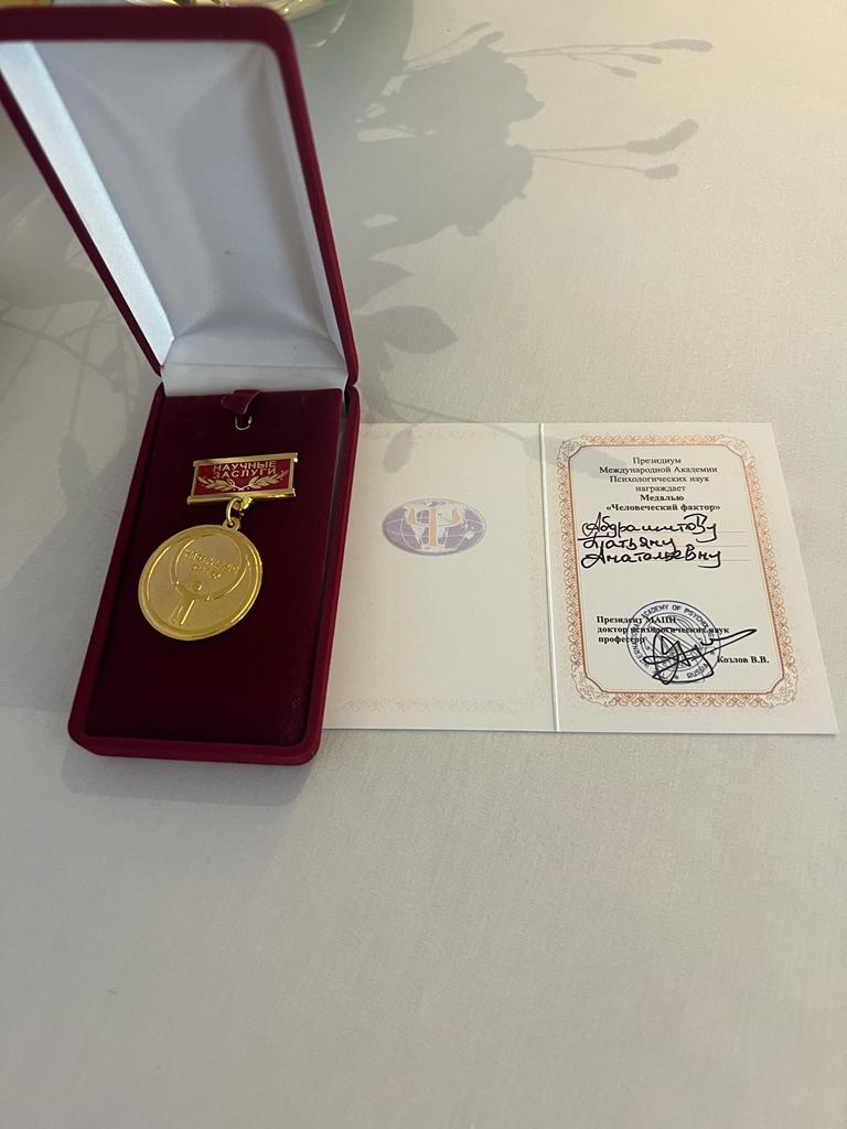 The staff of the A.K. Kussayinov Eurasian Humanities Institute congratulates Doctor of Psychology, Professor Tatyana Anatolyevna Abrashitova with the award of the medal for scientific merits “Human Factor” of the International Academy of Psychological Sciences (Russian Federation)!