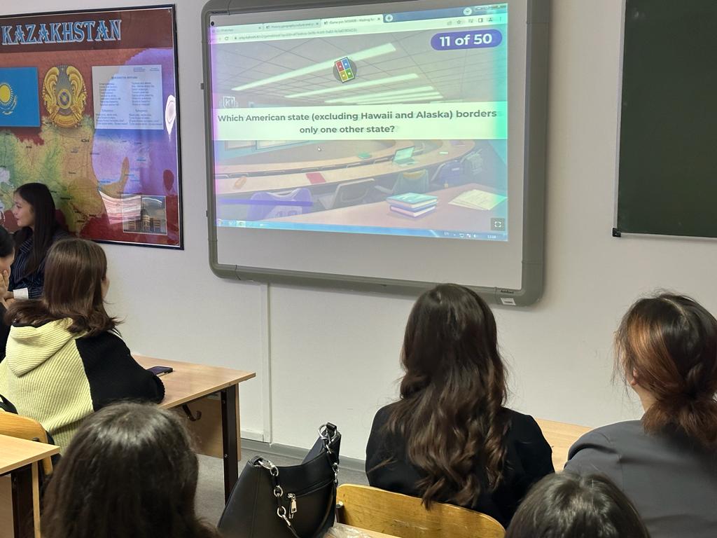 On November 8, 2023, in order to support students’ motivation to learn English, the curator of the Department of Foreign Languages Sarsenova A.M. held a game on the topic: “History, geography, culture and government of the USA” in academic groups ShT-22-01, ShT- 22-02 (2nd year, educational program “Foreign language: two foreign languages”). The winners were presented with memorable gifts.