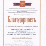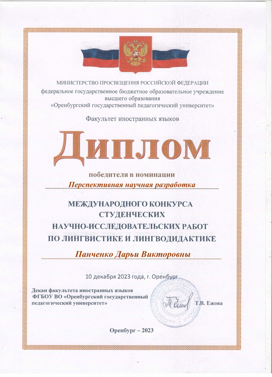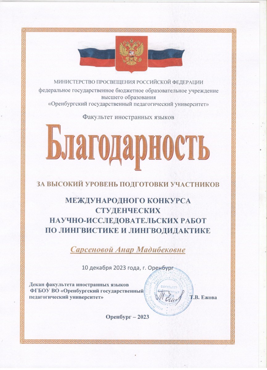 Students of the 1st and 2nd years of the educational program “Foreign Language: Two Foreign Languages” (academic groups YIA-23-01, ShT-22-01) Panchenko Daria and Islyam Alma took part in the International Competition of Student Research Works in Linguistics and Linguodidactics” under the guidance of a senior teacher Sarsenova A.M. The competition was held by the Faculty of Foreign Languages of the Orenburg State Pedagogical University.
