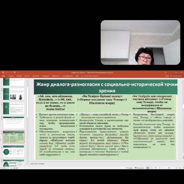 During the lecture Bayturina U.K. revealed the originality of the Kazakh concept sphere through the prism of the dialogue-disagreement genre, considering it as a unique communication event. The lecturer shared her knowledge, exploring the factors of communicative mismatch and ways of expressing it, presenting a new look at the features of the author’s position.