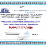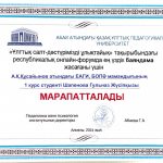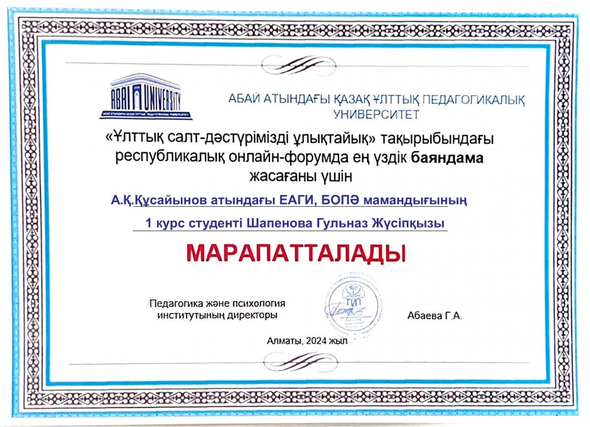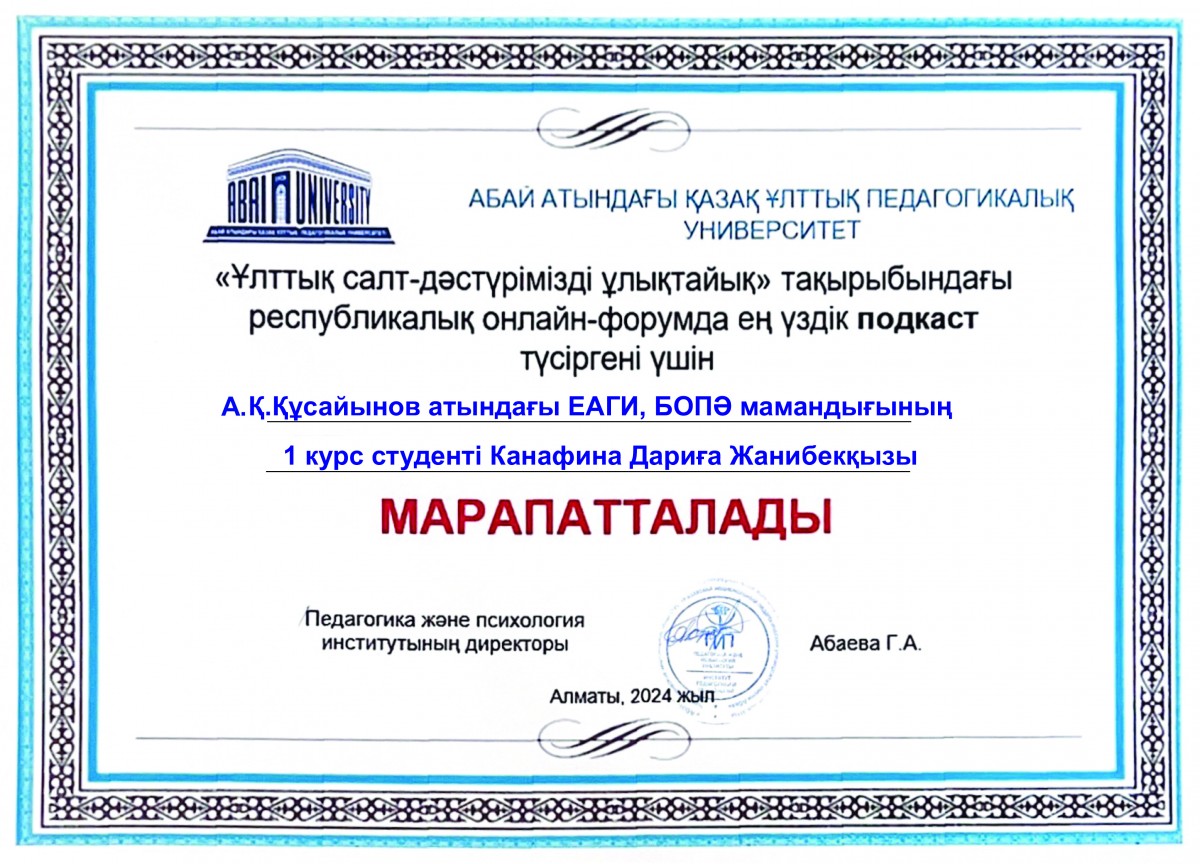On March 19, 2024, republican online forum of university students – future primary school teachers – was held on the topic: «Ұлттық салт-дәстүрімізді ұлықтайық» at the Institute of Pedagogy and Psychology of the Kazakh National Pedagogical University named after Abay. Students from EAGI – academic group BOT-23-01 – also took part in the forum. At the end of the forum, student from the group D. Zh. Kanafina was awarded for the best podcast, and a student from the group Shapenova G. Zh. was awarded for the best presentation.