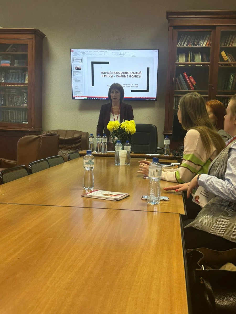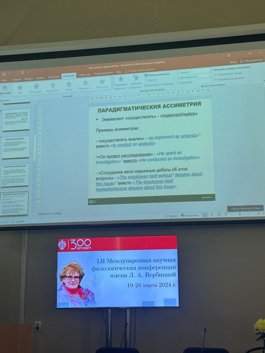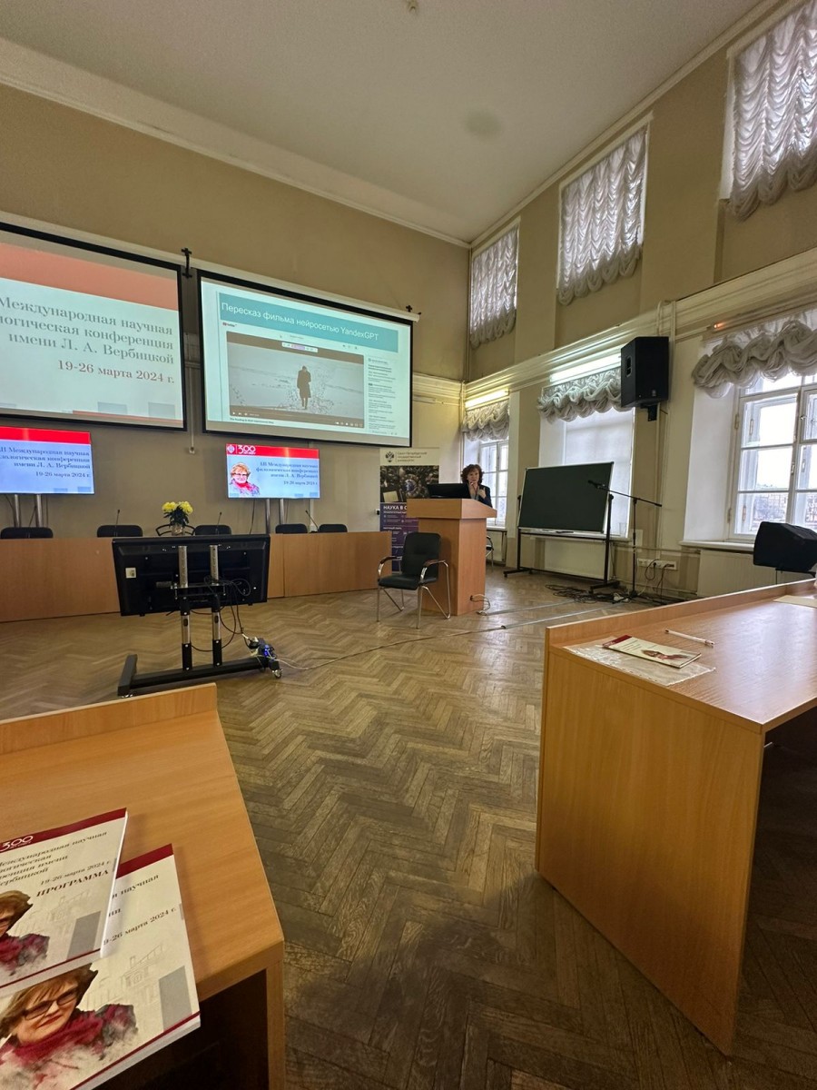 On March 26, 2024 senior teacher of the department Gylya A.A. presented a report on the research topic at the international philological conference at St. Petersburg State Universit , as part of the scientific project “Linguistic and cultural aspects of translating into English a modern literary fairy tale by Russian-speaking Kazakh authors,” which is being implemented at the Department of Foreign Languages of the EAGI under the guidance of candidate of pedagogical sciences, docent Volkova L.V..