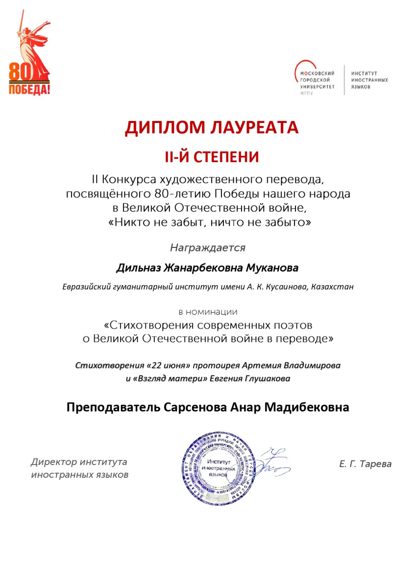 The administration and faculty of the EAGI congratulate the dean, candidate of pedagogical sciences, docent T.N. Kemaikina on receiving a letter of thanks from the Akim of Astana Zh. Kasymbek in honor of the celebration of the national holiday – Republic Day.
