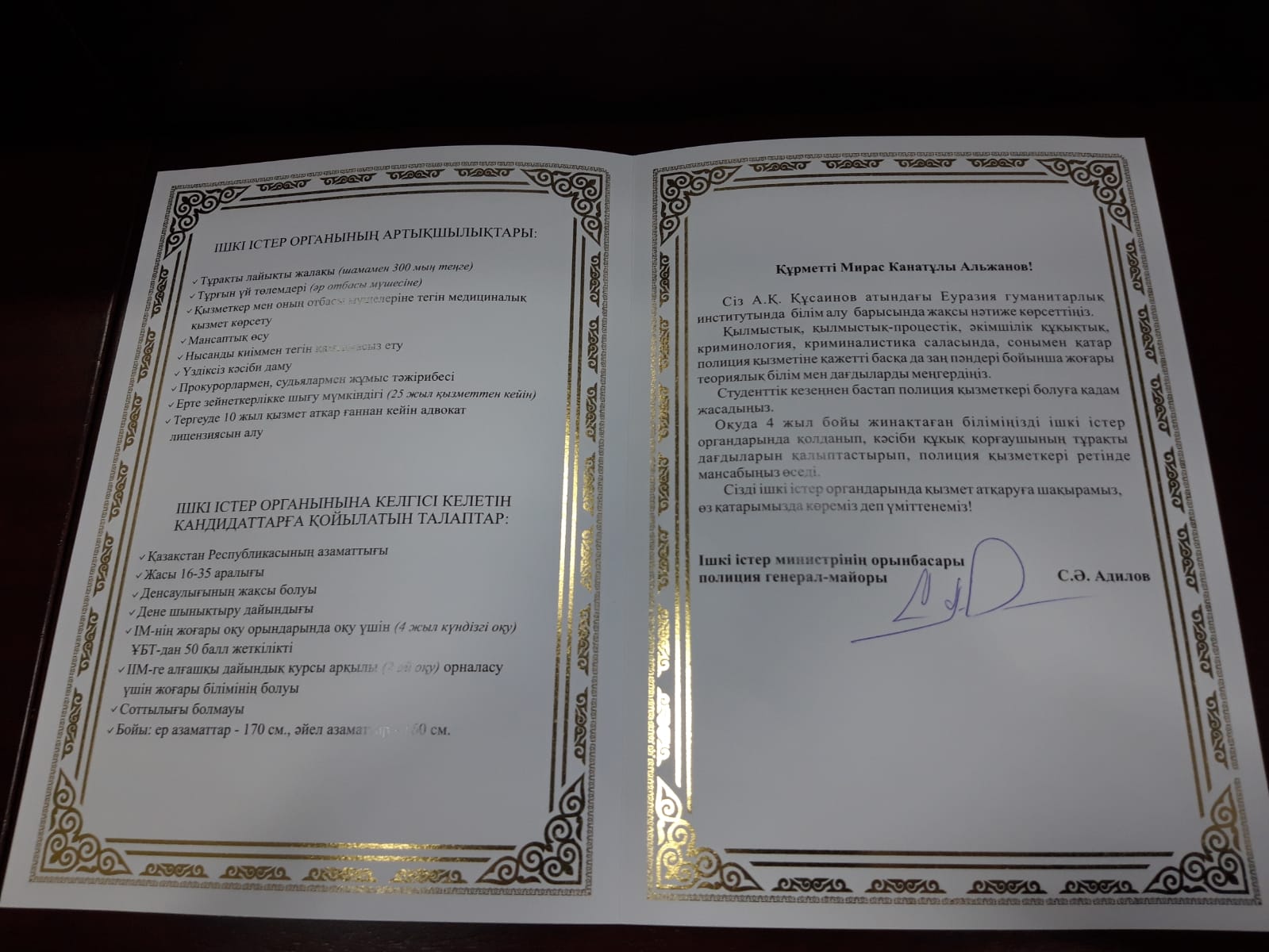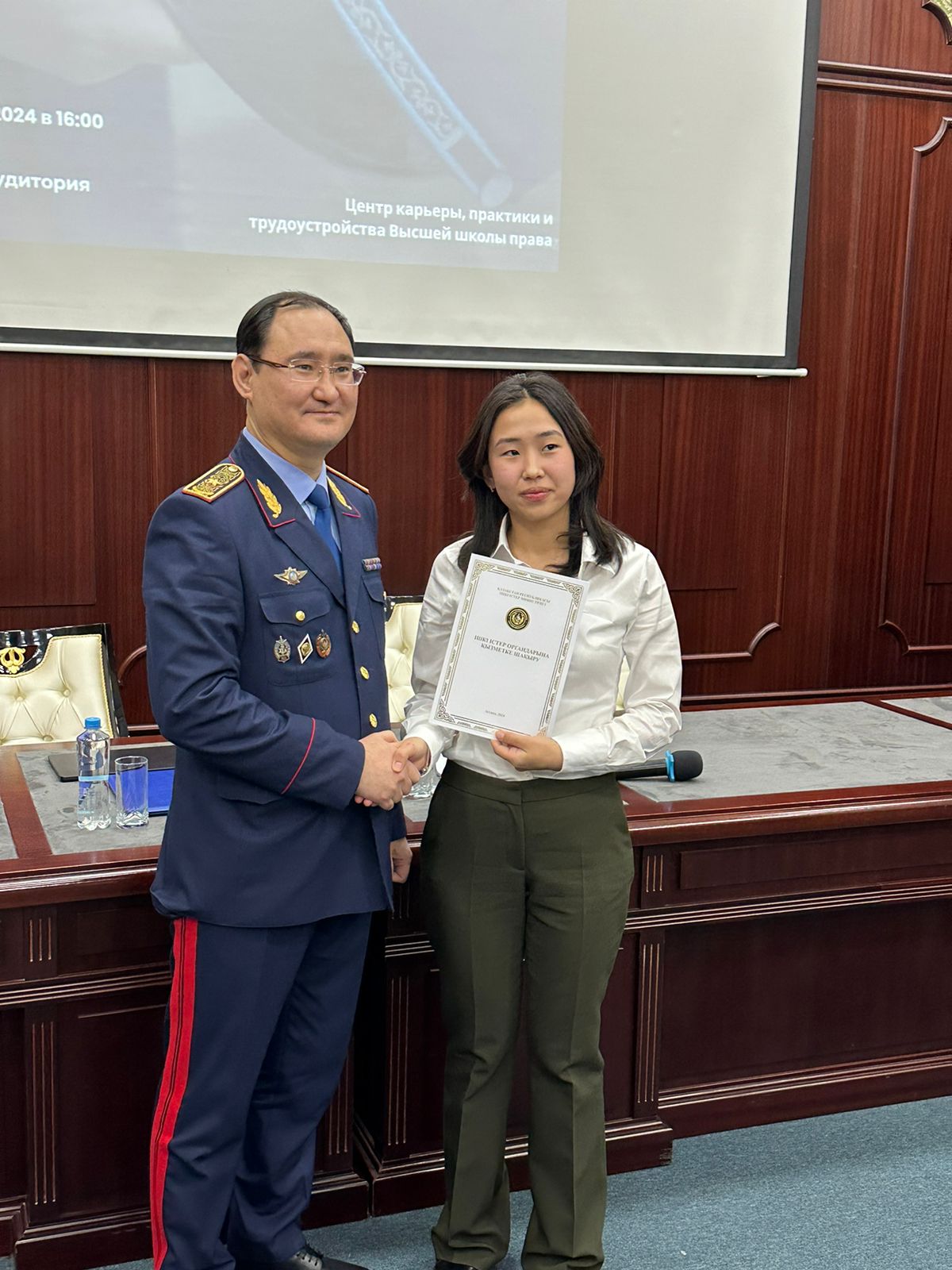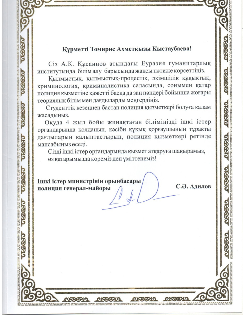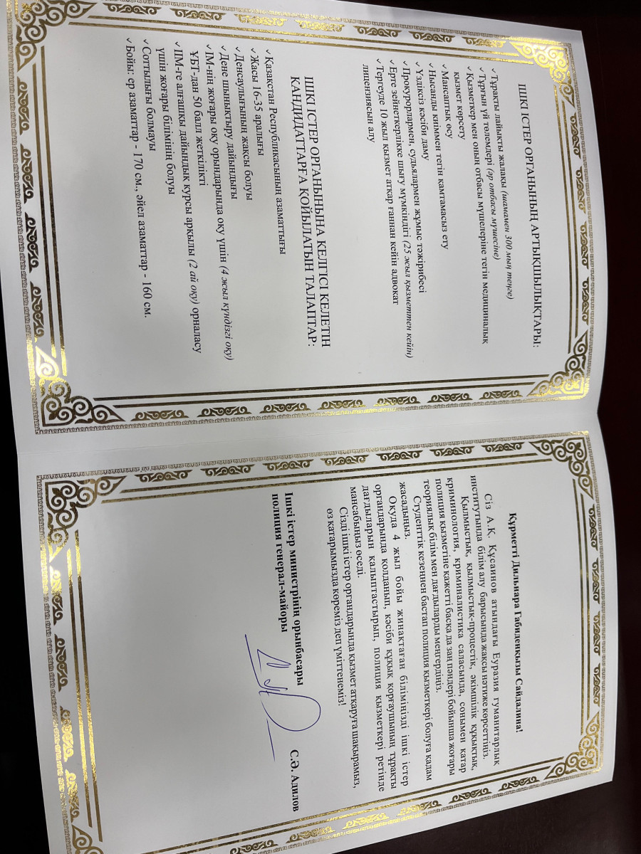 Также в этот день в торжественной обстановке студенты 4-го курса образовательной программы «Юриспруденция» Евразийского гуманитарного института имени А.К.Кусаинова Альжанов Мирас, Кустаубаева Томирис и Сайдалина Дильнара, прошедшие конкурсный отбор среди лучших выпускников-юристов столичных вузов, из рук вице-министра внутренних дел РК, генерал-майора полиции Адилова С.А. получили именные приглашения на работу в органах внутренних дел.