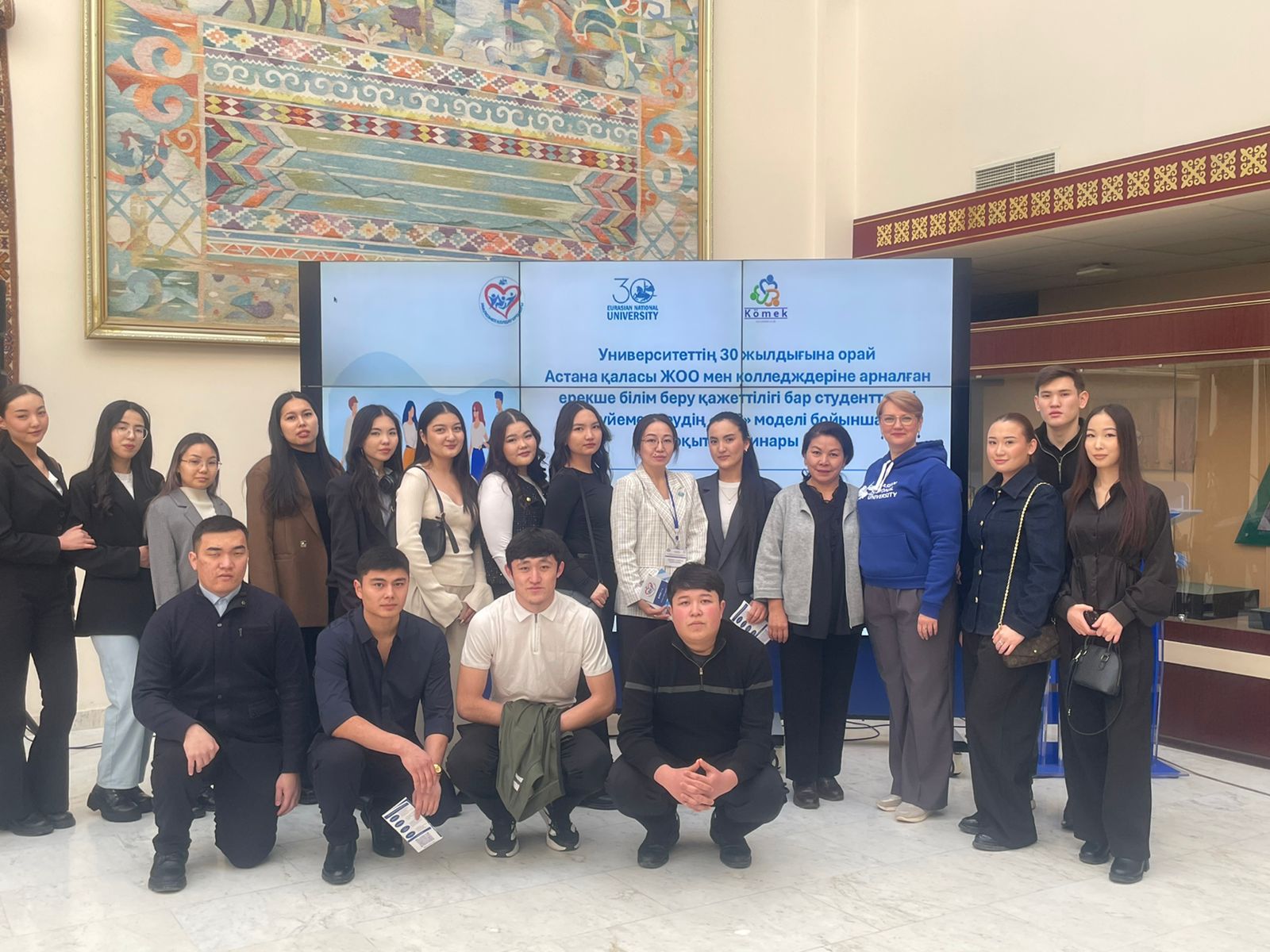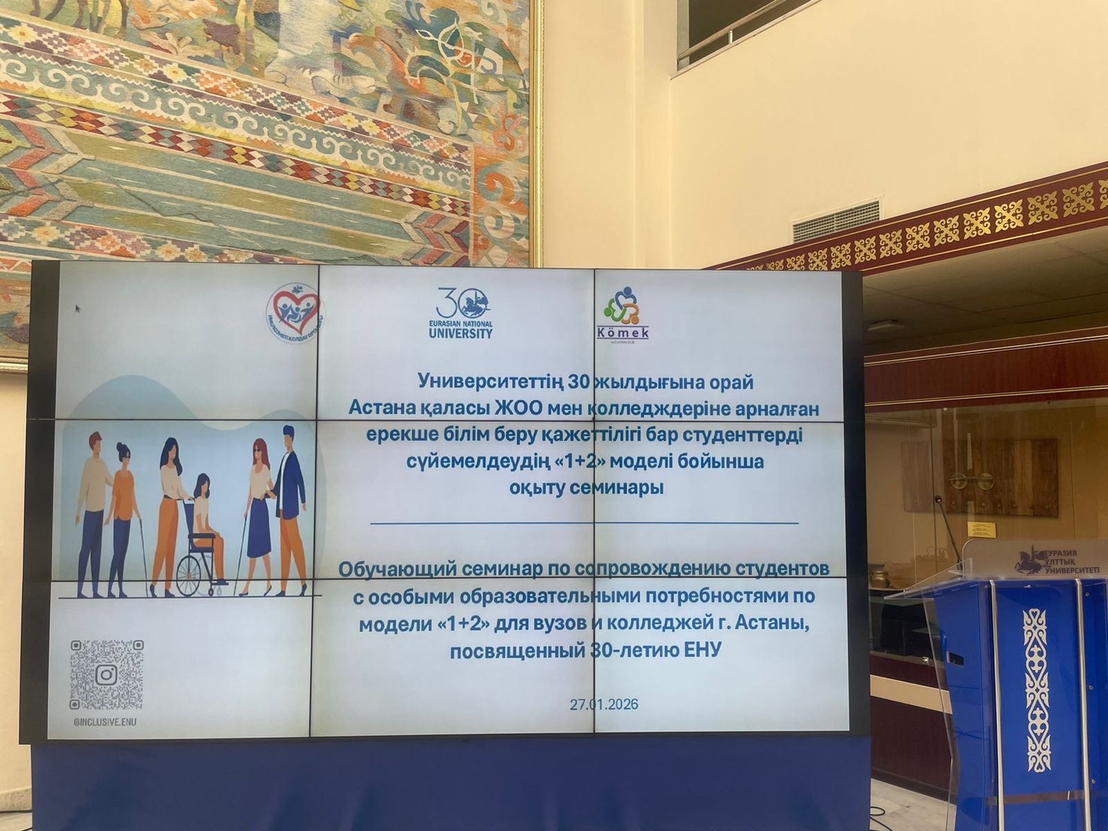 On January 27, 2026, a seminar was held on the “1+2” model of supporting students with special educational needs for higher education institutions and colleges in Astana at the initiative of L. N. Gumilyov Eurasian National University. The seminar was attended by Docents of the Department of Pedagogy and History of EAGI — A. T. Ayazbayeva, Zh. E. Turmanova, as well as third-year students of educational programs: 6B011 — “Pedagogy and Psychology”, 6B013 — “Training of Teachers without Subject Specialization”, 6B016 — “Training of Teachers in Humanities”.