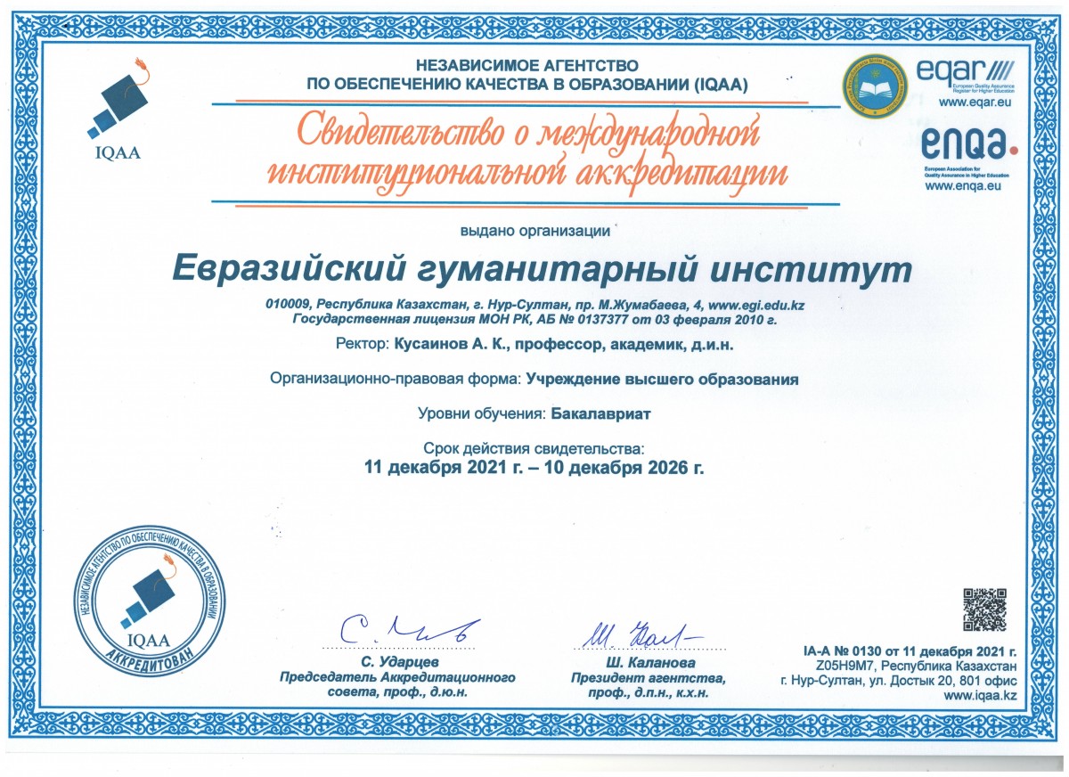 Education (IQAA) dated May 28, 2022, the Eurasian Humanities Institute