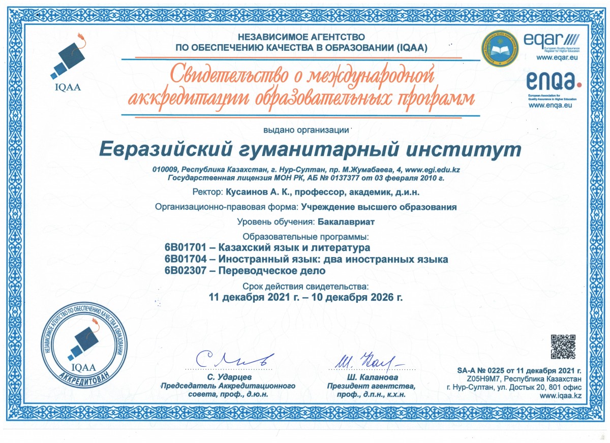 Education (IQAA) dated December 11, 2021, the Eurasian Humanities