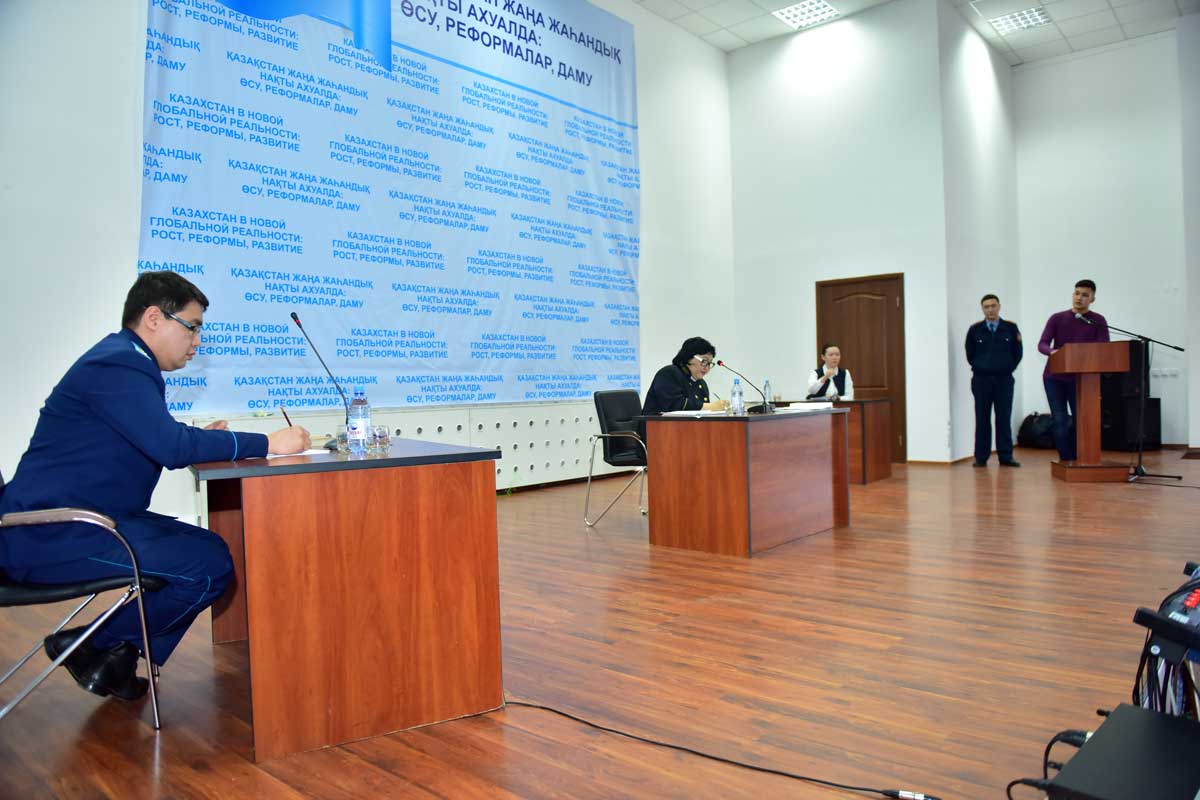 2016 жылдың 31 наурызында Еуразия гуманитарлық институтының Конференц-залында мамандандырылған әкімшілік соттың төрешісі Аркабаева К.Ж., Астана қаласының Алматы ауданы прокуратурасының өкілі Мустафин К., Алматы ауданы ІІБ-ның жергілікті полиция қызметі бастығының орынбасары, полиция подполковнигі Айшыбеков А.А., БАҚ-тың өкілдері және институттың оқытушылары мен студенттері қатысқан көшпелі көрнекі сот өтті. Соттың қарайтын ісіне, Қазақстан Республикасының әкімшілік құқықбұзушылық туралы Кодексімен қарастырылған, әкімшілік құқықбұзушылық болып табылатын, ұсақ бұзақылықтар алынды. Көрнекі сот үдерістері біздің қаламызда, жастардың құқықтық білім алуларына бағытталған, дәстүрлі алдын алу шаралары болып табылады. Көрнекі үдерістің ең маңызды мақсаты – ол студенттерге жазаның қолданылмай қалмайтындығы туралы принципінің жұмысын көрсету.