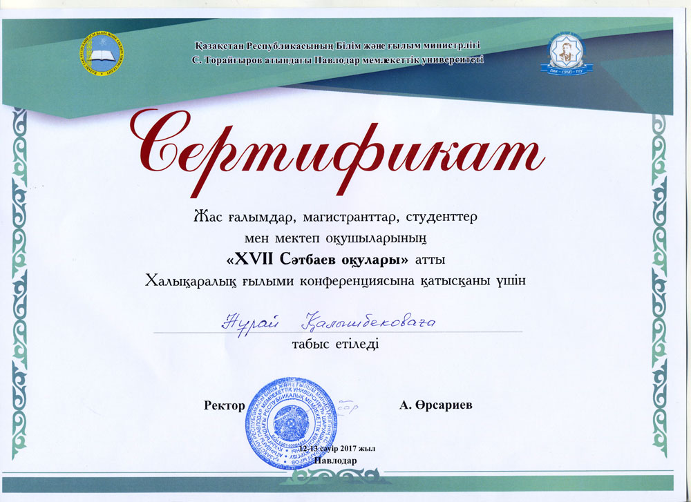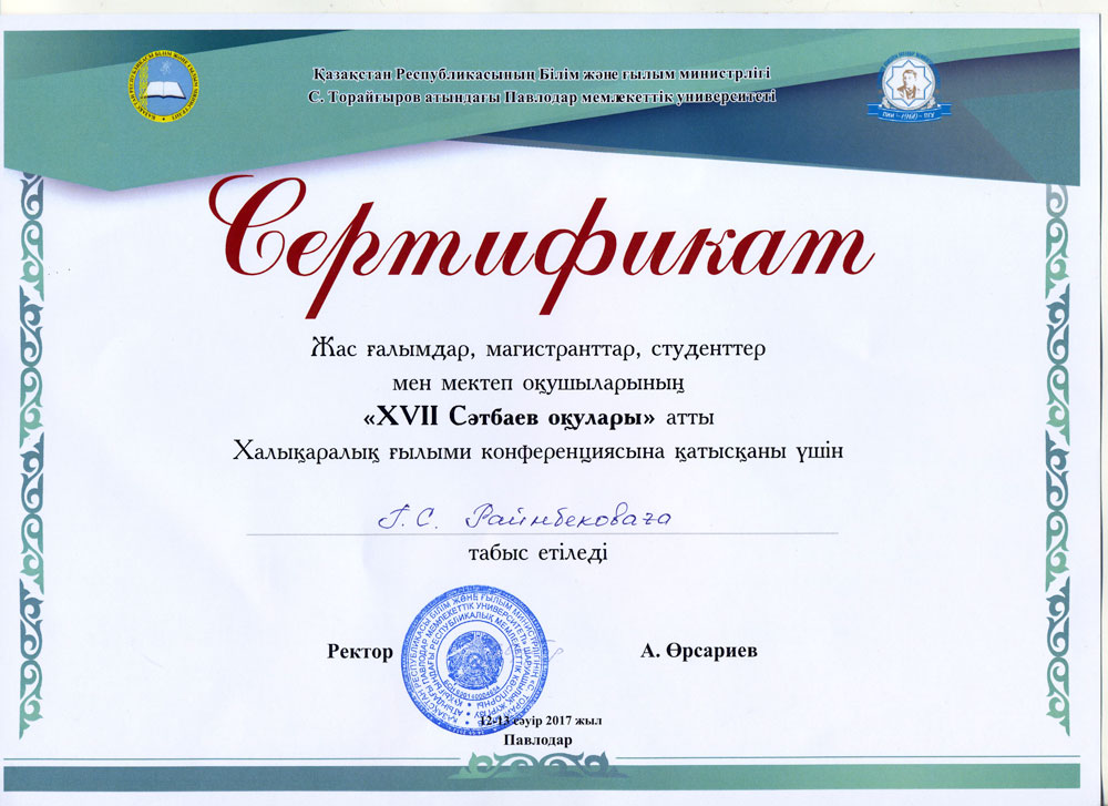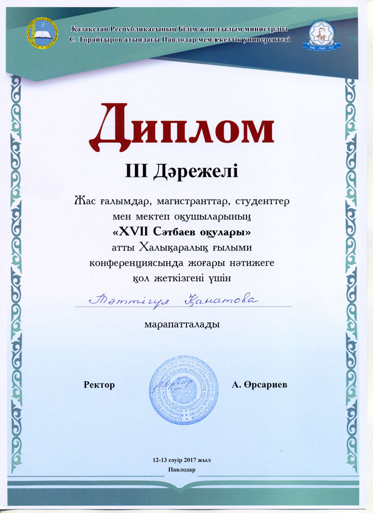 2017 жылғы 12-13 сәуірде С.Торайғыров атындағы Павлодар мемлекеттік университетінде өткен жас ғалымдар, магистранттар, студенттер мен мектеп оқушыларының «ХҮІІ Сәтбаев оқулары» атты Халықаралық ғылыми конференциясына қатысып, ІІ жүлделі орынды иеленген «Шет тілі: екі шет тілі» мамандығының 4 курс студенті Аида Нуранова (ғылыми жетекшісі: п.ғ.к., доцент Л.В.Волкова) мен ІІІ жүлделі орынды иеленген «Қазақ тілі мен әдебиеті» мамандығының 2-курс студенті Тәттігүл Қанатованы (ғылыми жетекшісі: п.ғ.м., аға оқытушы Г.С.Райнбекова) ҚҰТТЫҚТАЙМЫЗ!