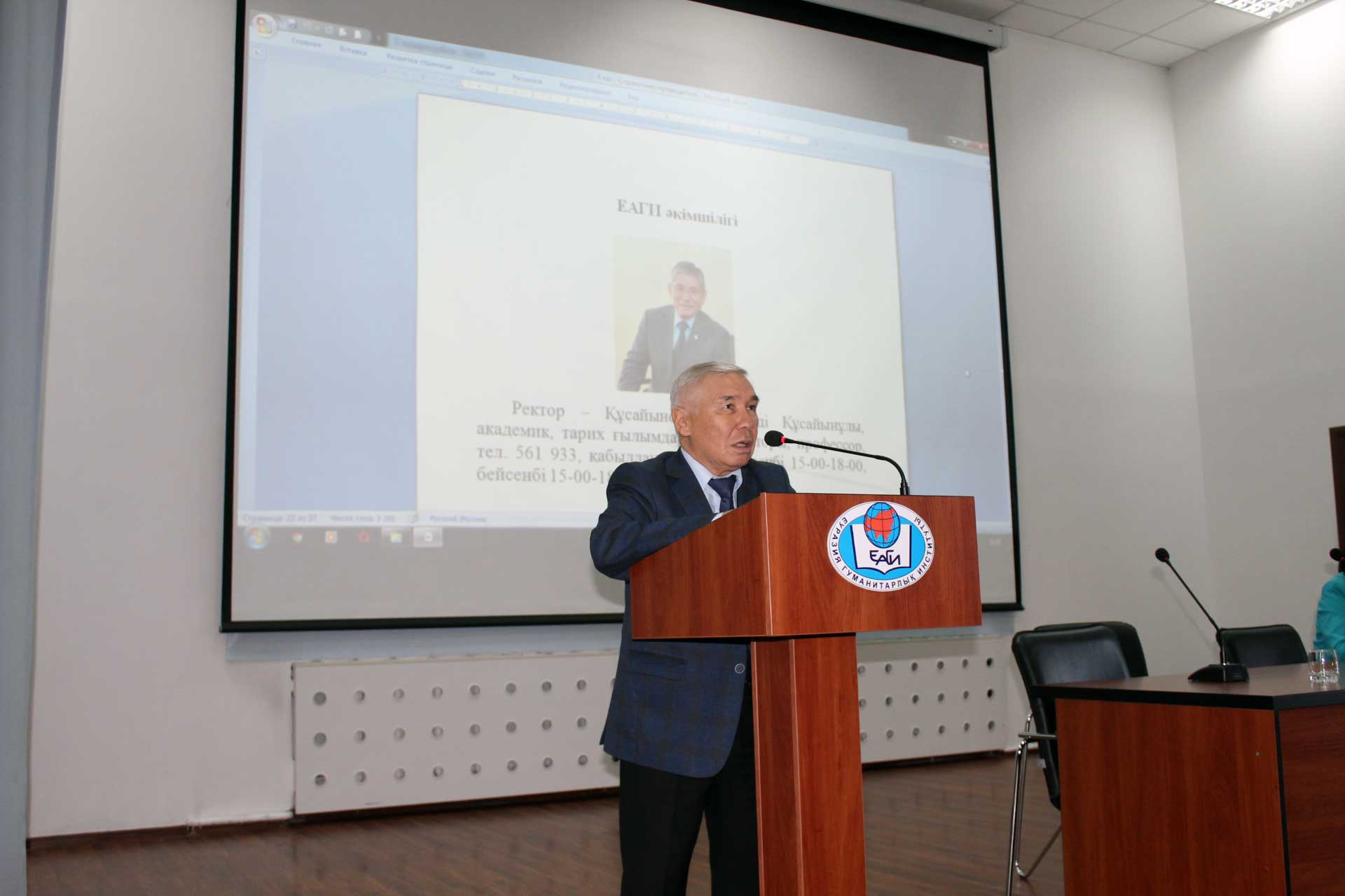 Бірінші курс студенттерін оқу және ғылыми жұмыс жөніндегі проректор т.ғ.д., профессор Қ.Ә. Ахметов, институттың деканы, ф.ғ.к., доцент Қ.А. Мамаділ құттықтап, ЕАГИ-дегі оқу және тәрбие жұмысының негізгі ережелері туралы баяндады. Кездесу барысында студенттер сұрақ қойып, пікір алмасты. Сондай-ақ студенттер алдында пресс-орталықтың жетекшісі И.С. Воронцова, ЖІК төрағасы Н. Тырнахан сөз сөйледі.